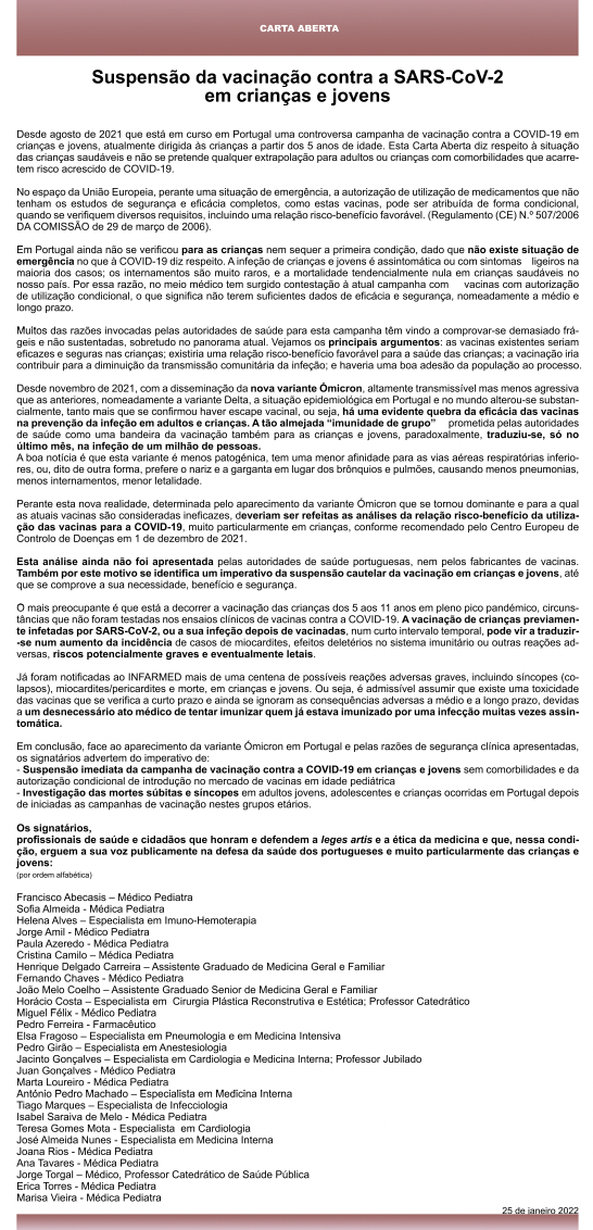 Nesta carta são 27 subscritores, que entretanto passaram a ser 91. Em relação à desinformação é aquilo que tu achas, outros terráqueos acharão que a informação e argumentos apresentados são bastante válidos, por acaso viste o video do Dr. Francisco Abecassis (Assistente Hospitalar Graduado de Pediatria no Hospital de Santa Maria (CHULN) e Subespecialista em Cuidados Intensivos Pediátricos. É Doutorado em Medicina pela Faculdade de Medicina da Universidade de Lisboa)Pata-Hari Escreveu: que são 26 subscritores, nem todos médicos. Francamente, considero isto desinformação. Sem números e estatísticas, isto é simplesmente espalhar desinformação.