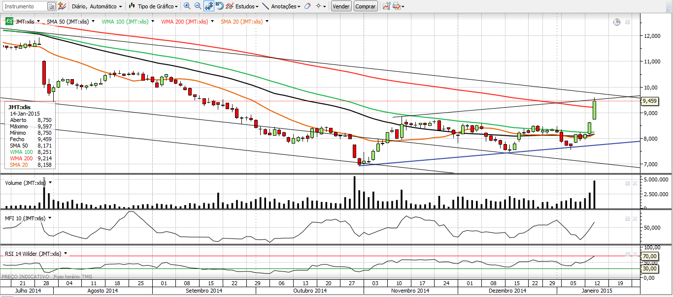 Graças aos resultados e ao bias positivo (traduzido no spike da cotação e do volume, acima da MM20, MM50 e MM100), rompeu com 5 meses de canal, e a LTMP passou a ascendente.
