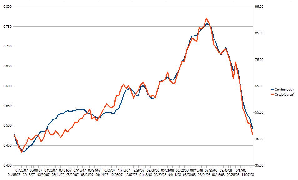 Parece-me que deste gráfico se consegue subir que a força a subida do petroleo, corresponde subida dos combustiveis imediatamente e com força semelhante, ao passo que a descida se faz com maior dilação temporal e de forma menos intensa.