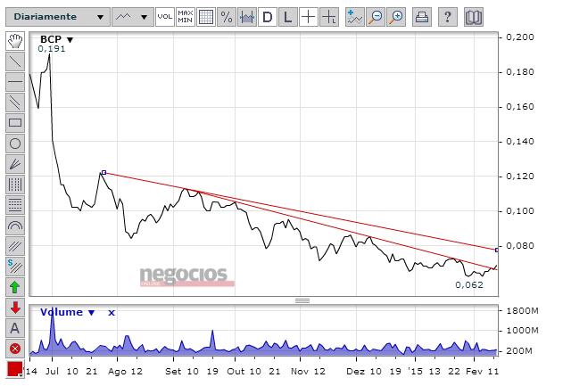 Deixo para os mais afoitos a tentativa de arrecadar ganhos na zona entre as duas linhas traçadas. Eu pretendo entrar, apenas, quando romper a segunda linha, pois considero essa opção mais prudente ... Eu sou daqueles que quando aposta é para valer e por isso há que ser paciente (já não tenho ações do BCP desde final de 2013 e nas últimas que tive,(bem mais de um milhão delas, ganhei muitos milhares de euros) e escolher o momento.