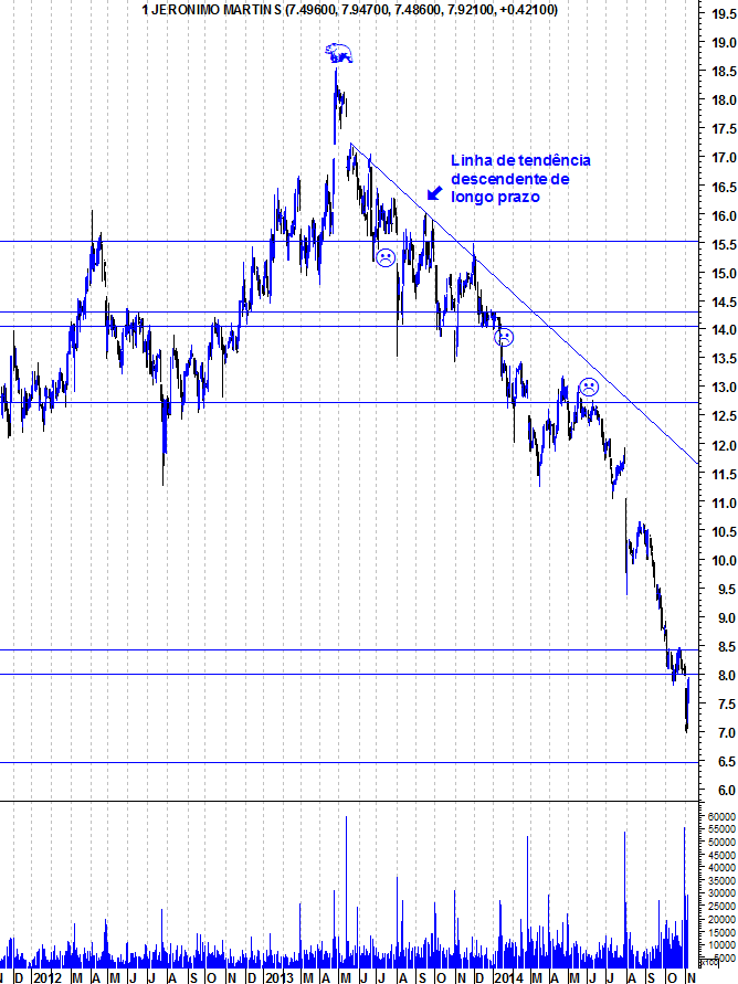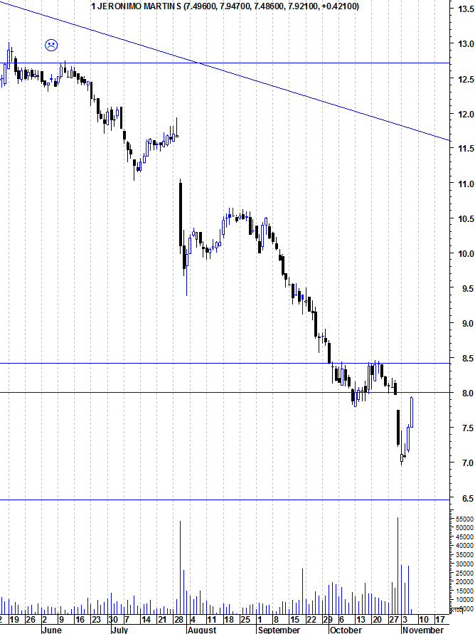 O mais interessante na JM é que pode ter feito ali um "gap" de exaustão. Um ano e meio de quedas e um "gap" com volume fortíssimo, pode ser exaustão de vendas. Veremos. Para já, está a chagr à sua primeira zona de resistência entre os 8 (zona do "gap") e os 8,4 (último mínimo relativo).