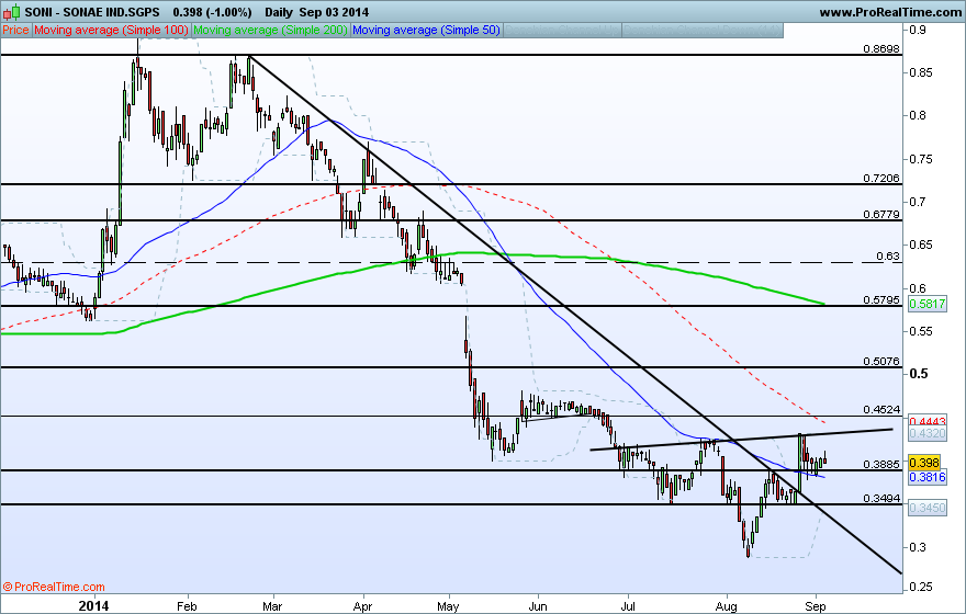 A tendência da SONI é descendente...quebrou uma LTD, está junto a um suporte, apesar do mais importante ser nos 0,35.