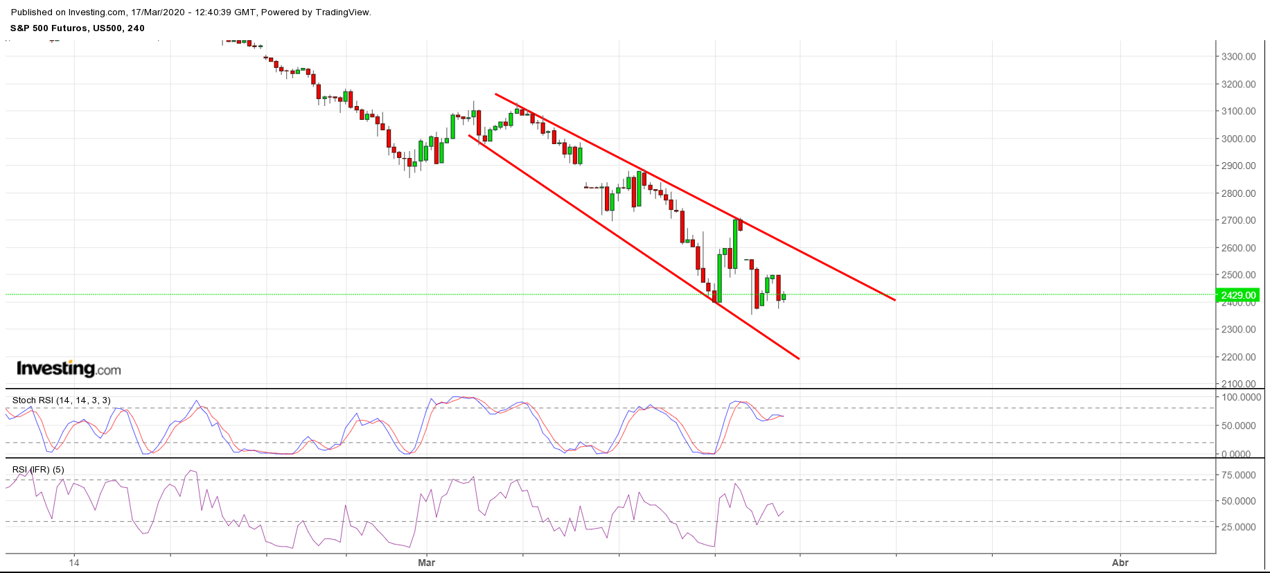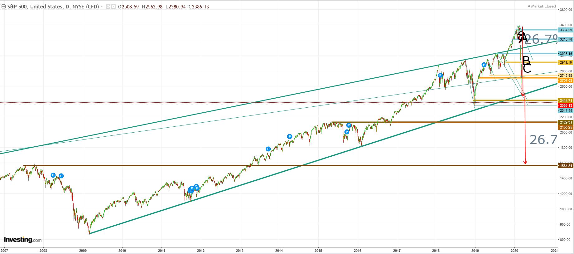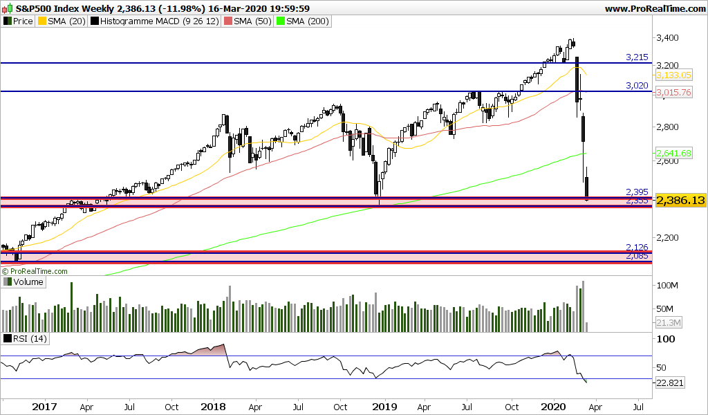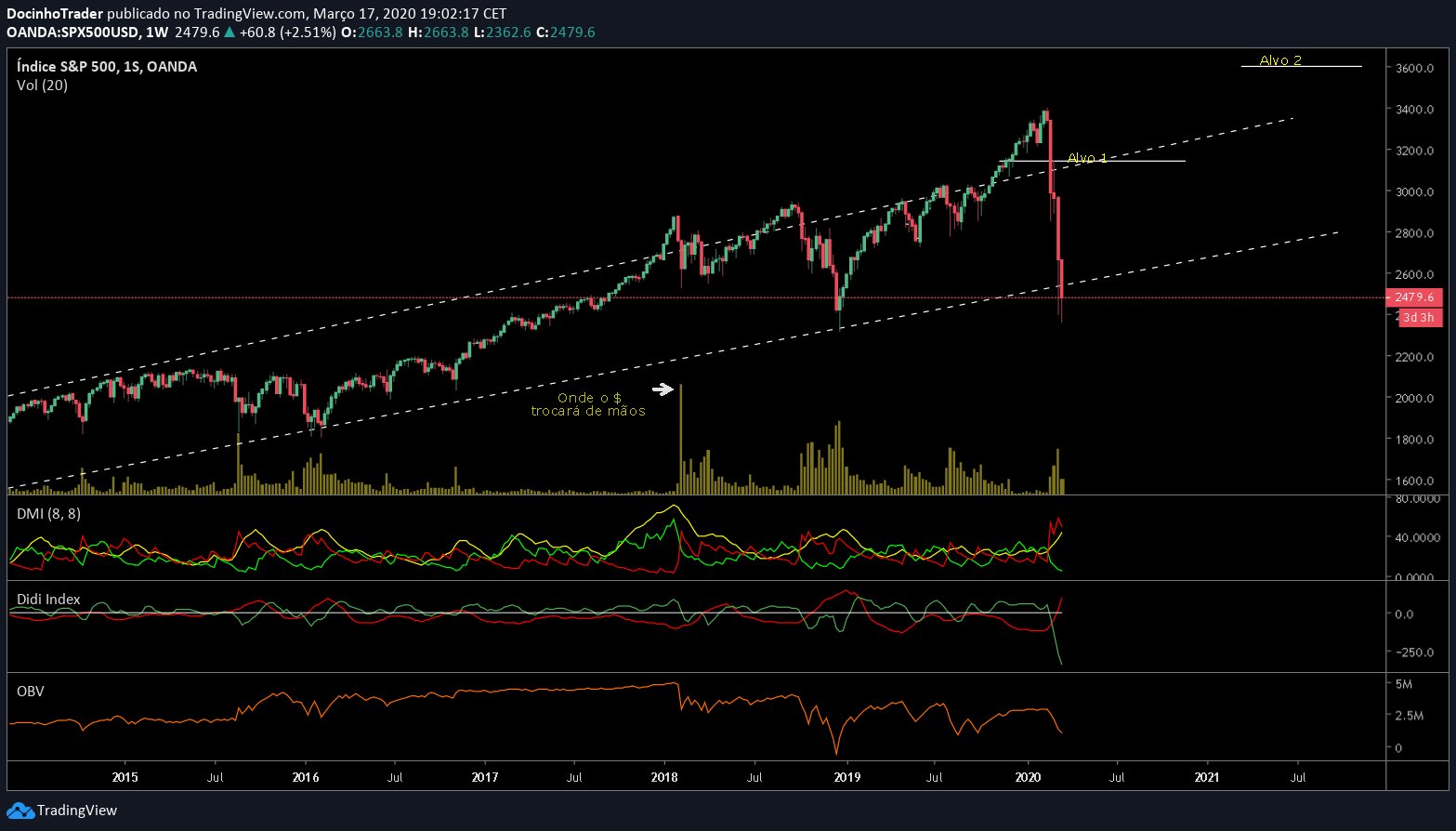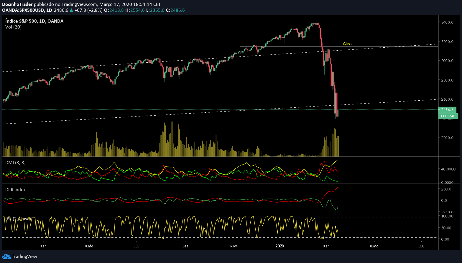 Após queda de 12% hoje no S&P500 (o índice já caiu 34% do máximo histórico e máximo recente), mais do que provável um forte rebound já amanhã. 6 fatores para tal: 1) deeply oversold; 2) exaustão das vendas nos últimos 15 minutos de transações; 3) 3 indicadores a potenciar uma recuperação RSI nos 30,17, MACD em mínimos e cruzamento da mediana no ADX; 4) Futuros S&P a subirem 92 pontos (e restantes 3 grandes índices tb com subidas de 3 a 3,5% no after hours); 5) proximidade assustadora a mínimos de 2018, que funciona como Suporte primário, nos 2351 pontos;
