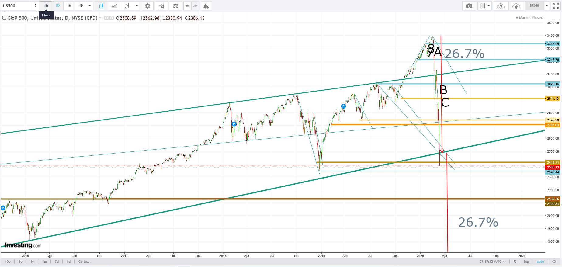 nota - Esta fase Bear dos mercados, que se pode prolongar até aos 50% de queda no S&P (já caiu 34%), antecipa e desconta 2 trimestres fortemente recessivos (-4% no PIB do 1º trim./-6% no PIB do 2 ºtrim. e de -1,8% no total do ano, após recuperação nos 3º e 4º trimestres) e significa que o Shutdown viral nos USA, em ambiente deflacionário destrói mais valor do que uma Guerra (September eleven, 2ª Guerra Mundial ou Vietnam, o PIB continuou sempre a crescer com vigor, apenas com a inflação a fazer mossa na 3ª referida), e a queda abrupta de 34% também indica que o Virus atacou mais depressa do que a brutal crise financeira de 2008: nessa crise os aviões continuavam a voar, os consumidores continuaram a consumir, um pouco menos, e o tecido económico continuou a funcionar em moldes normais (excetuando sistema financeiro que esteve próximo de um colapso generalizado).