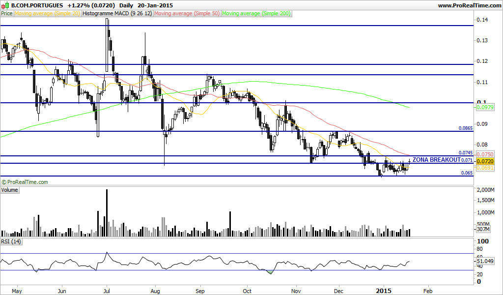 Depois de uma re-análise ao título, vê-se agora uma nova cara técnica no BCP. Aparentemente estão afastadas as nuvens negras e os sinais apontam já para novas subidas. Hoje, a resposta que o BCE poderá trazer amanhã já se fez sentir a meio do dia de forma mais clara. As quedas que se registavam em algumas das principais praças europeias inverteram para valorizações significativas no final do dia. Estou convicto de que o programa trará em todos os prazos boas perspectivas também para a nossa bolsa. Tecnicamente, apesar de não ter gostado inicialmente do primeiro toque na casa dos 0,07 cêntimos e abaixo dele, o BCP acabou por mostrar coerência neste suporte e usou-o bem para se lançar para cima. Da minha parte, vejo agora um bom potencial de valorização do título (sempre numa perspectiva técnica, ainda que reforçada pelo sentimento que se apercebe da Europa). Afasto já mais desvalorizações? Ainda não sei responder sob o ponto de vista técnico a esta questão. Terá de se ver mais adiante. Mas estou confiante em boas perspectivas daqui para a frente.