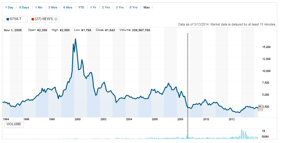 Em jeito de brincadeira deixo aqui um gráfico que apesar de tudo pode ser elucidativo para muita gente, pois mostra que o que era pode já nao ser mais o grafico não da SONI mas da SONY! esta empresa simplesmente perdeu capacidade competitiva e kaputi nunca mais recuperou! nao digo que a SONI siga o padrao da SONY, houve mesmo ja quem fizesse bom dinheiro com a subida da cotação recentemente, mas valores antigos nada... de quase 17000 desceu até900... e até o pico de 1997 nos 6000 parece uma miragem....
