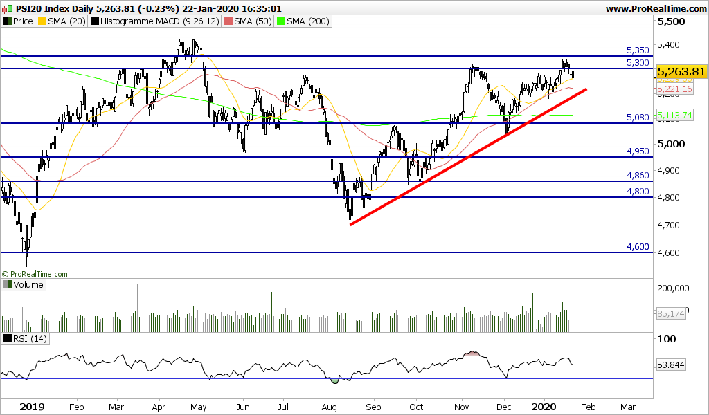 Nestas últimas 3 sessões, o PSI corrigiu muito ligeiramente, mas vai permitindo aliviar o RSI. Será interessante verificar se o índice depois voltar a atacar as resistências decisivas.