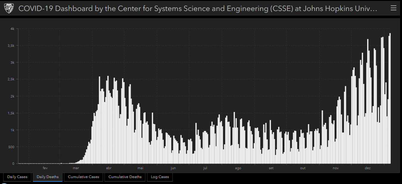 EUA registam máximo diário de mortes devido à Covid-19 pelo segundo dia consecutivoForam registados 3865 óbitos nas últimas 24 horas. Foram detetados também 253.145 novos casos de infeção diárias pelo coronavírus.