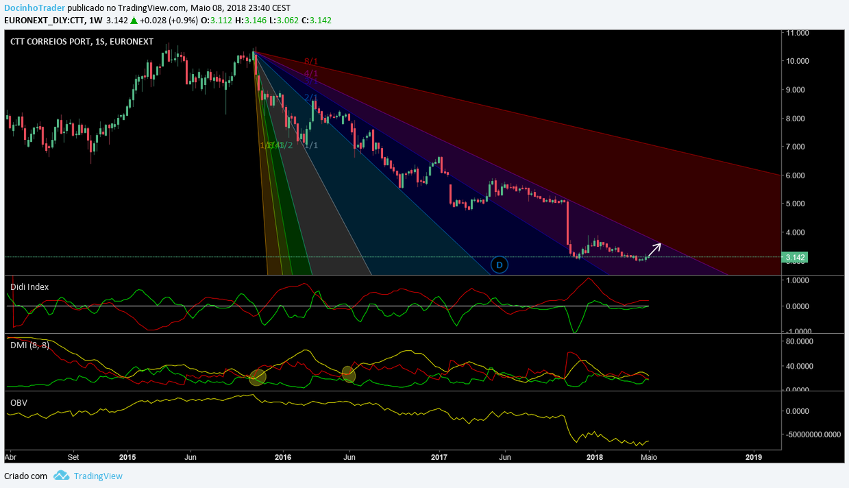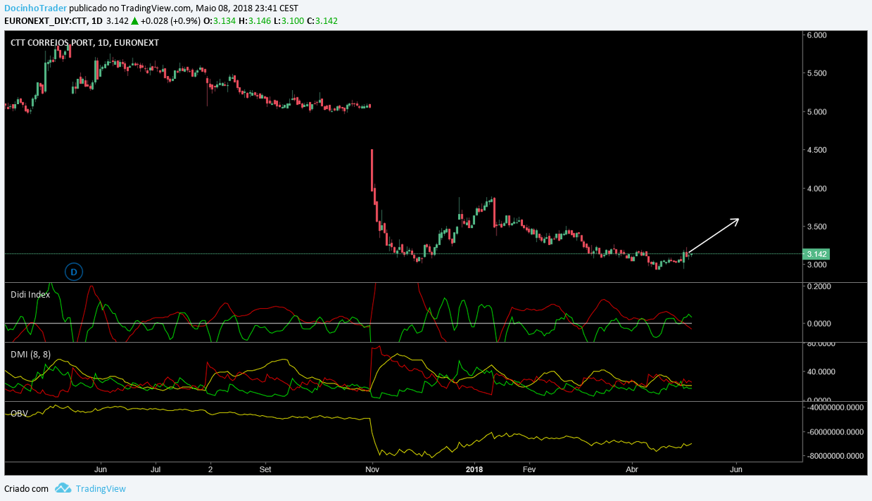 Penso que os ctt mereçem uma atenção especial neste momento. Apesar de no longo prazo(pelo semanal) estar em bear,no diário, surge neste momento uma pequena acumulação que pode levar a cotação a um repique,a um pouco mais acima(3.50-3.60€).