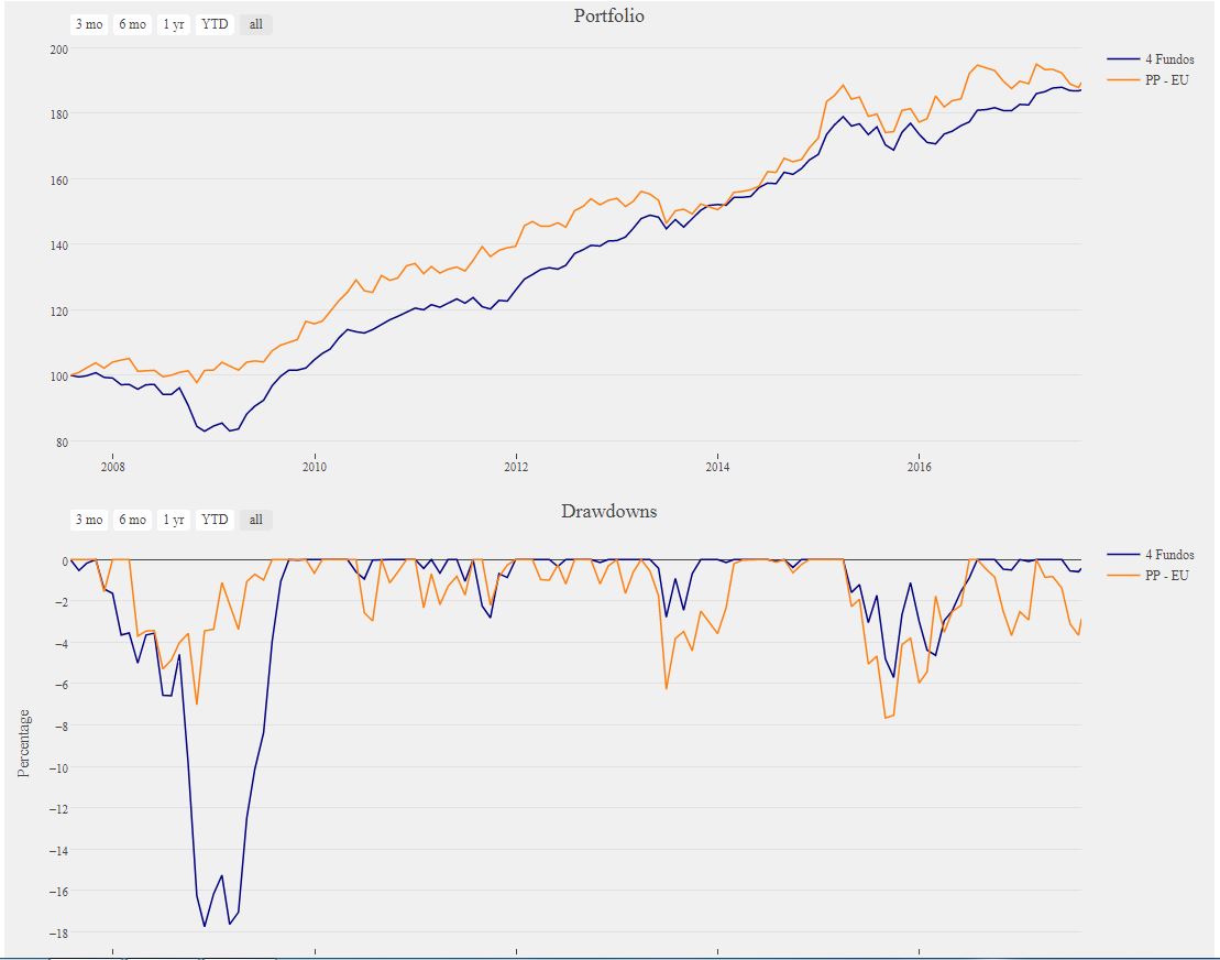 ) e estava numa de comparar um Portfolio Permanente (já lá vamos) com outras carteiras a 10 anos (vá, a começar a 2 de Junho de 2007).Primeiro comparei-a com o Portfolio 4 Fundos do VG: