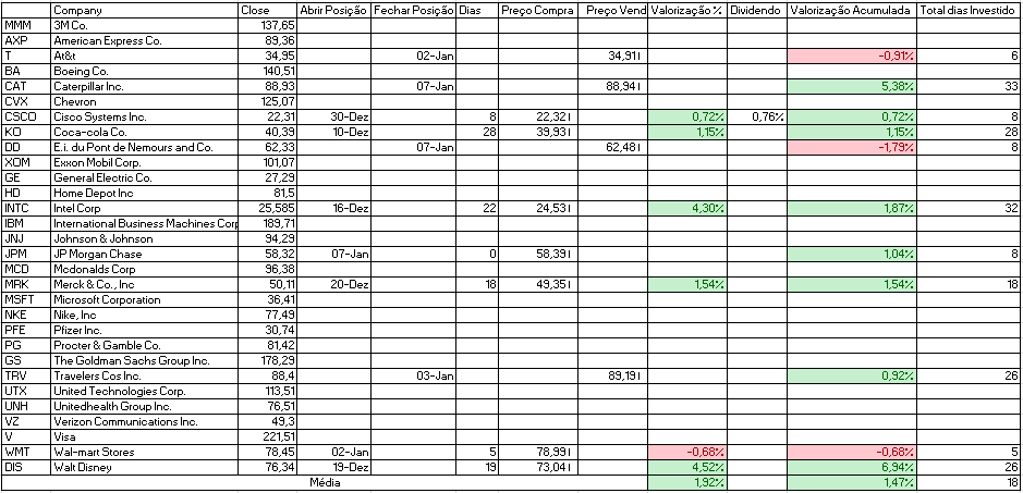 No primeiro dia do Ano vendemos a At&t e compramos E.i. du Pont de Nemours and Co., Wal-mart Stores e BPI.