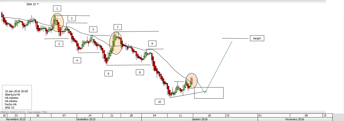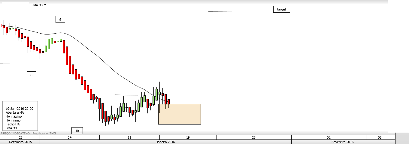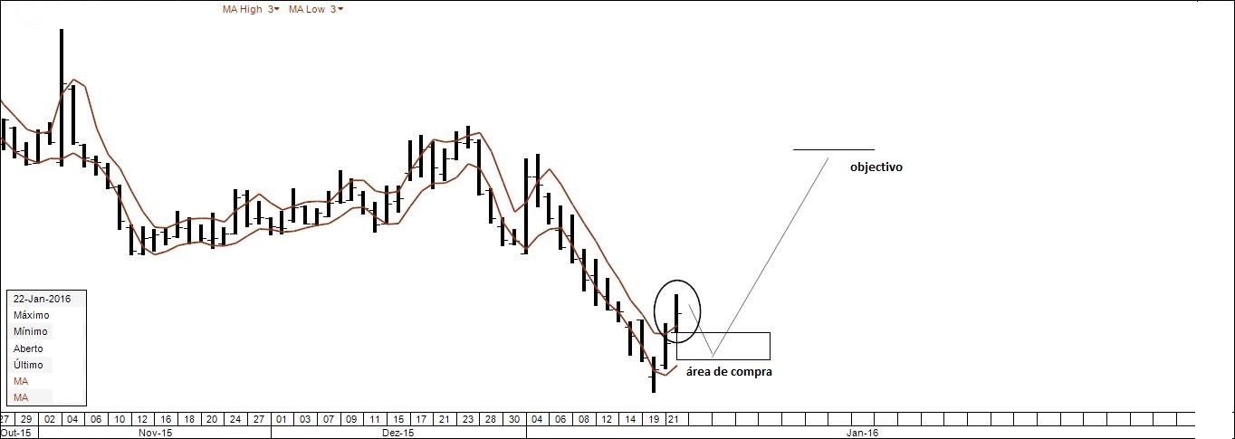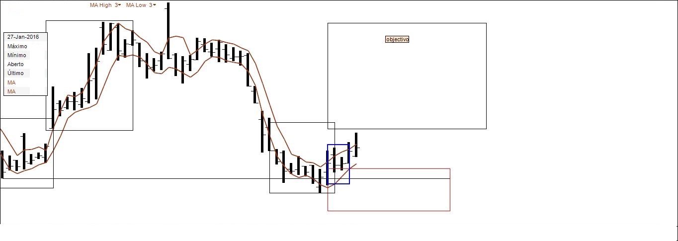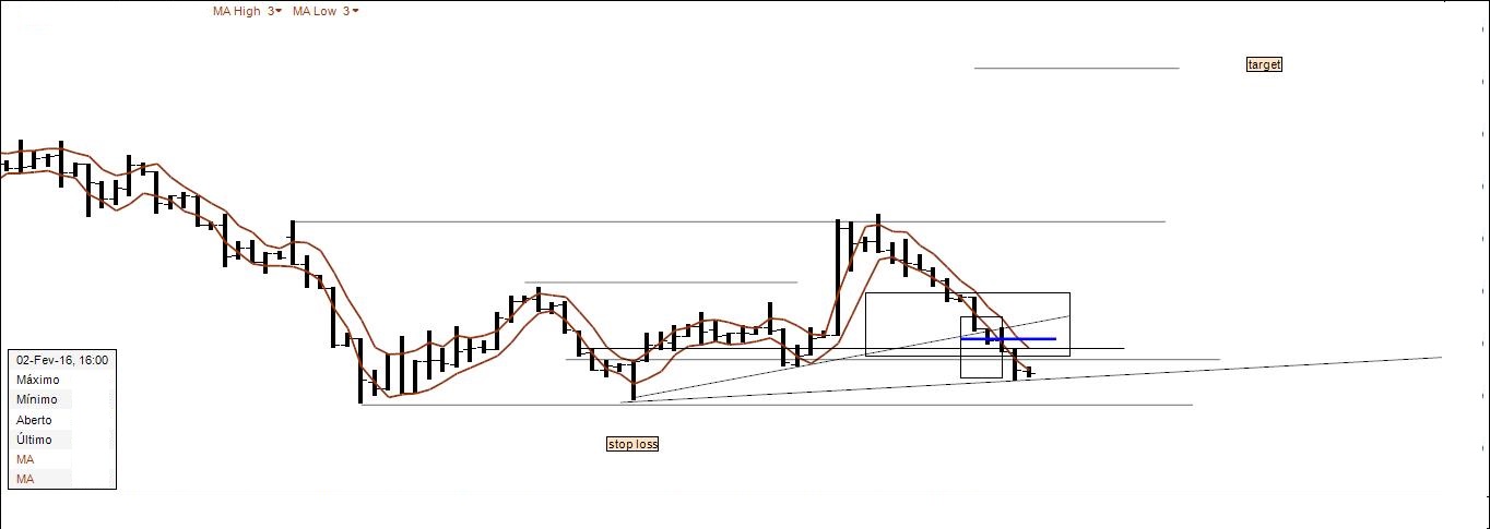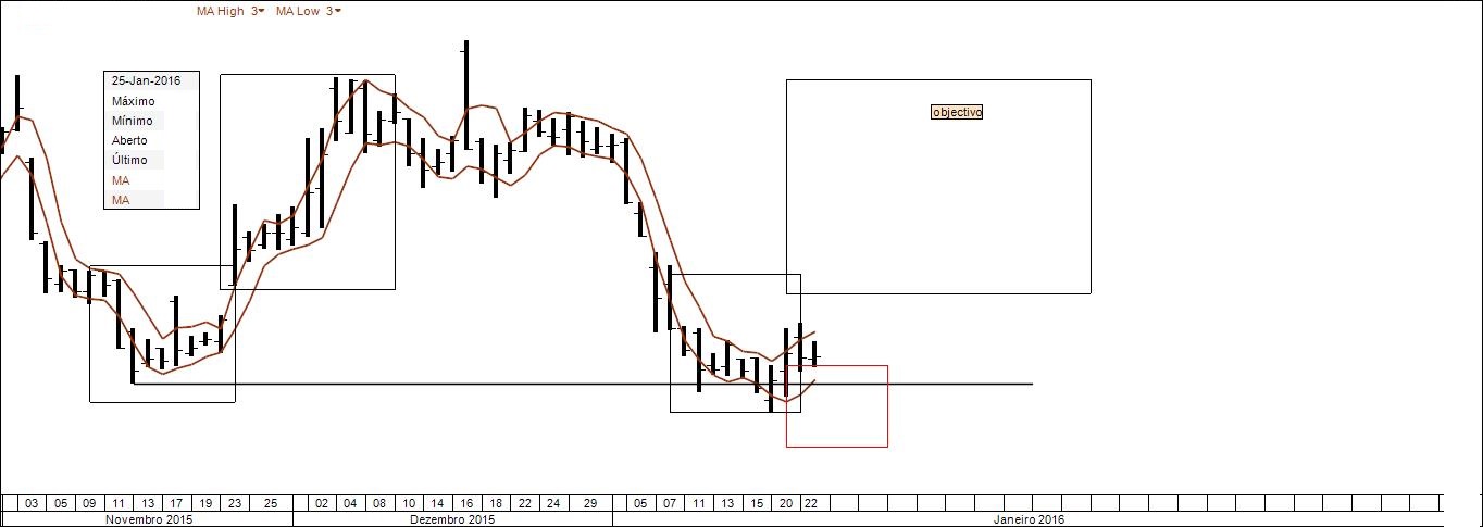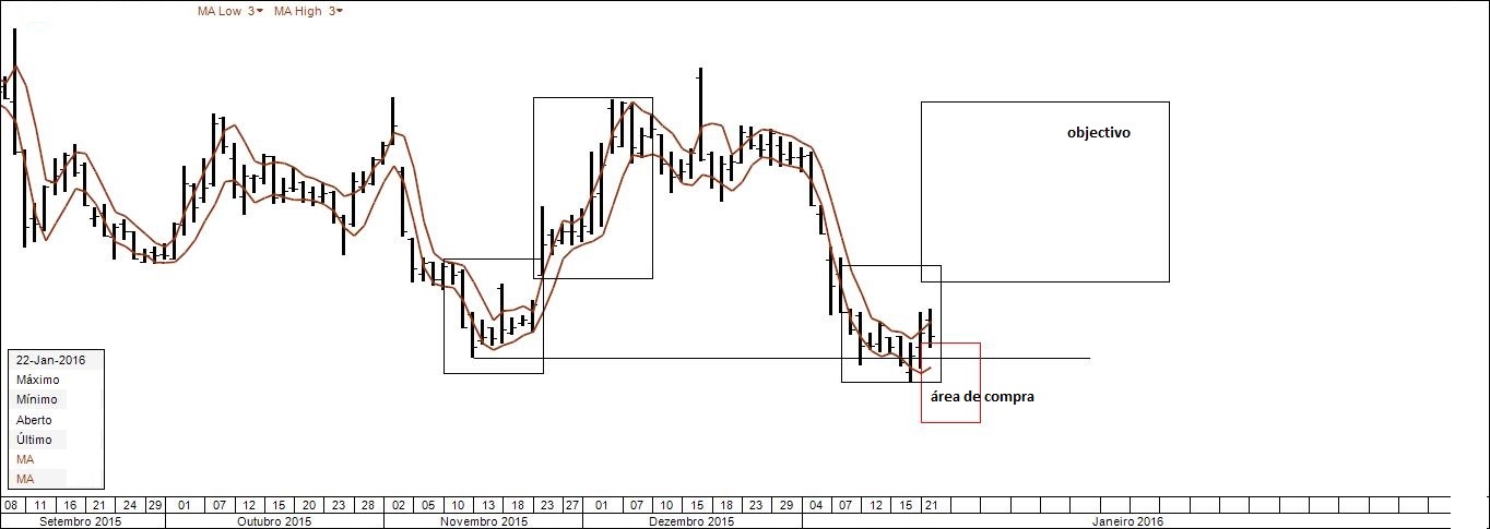 Uma oportunidade de investimento baseada na técnica aqui mencionada várias vezes: sma 3 low X sma 3 high x caixa de Darvas. Compra na caixa com target e stop loss assinalados. Negócio a realizar à margem do FIA 2016.