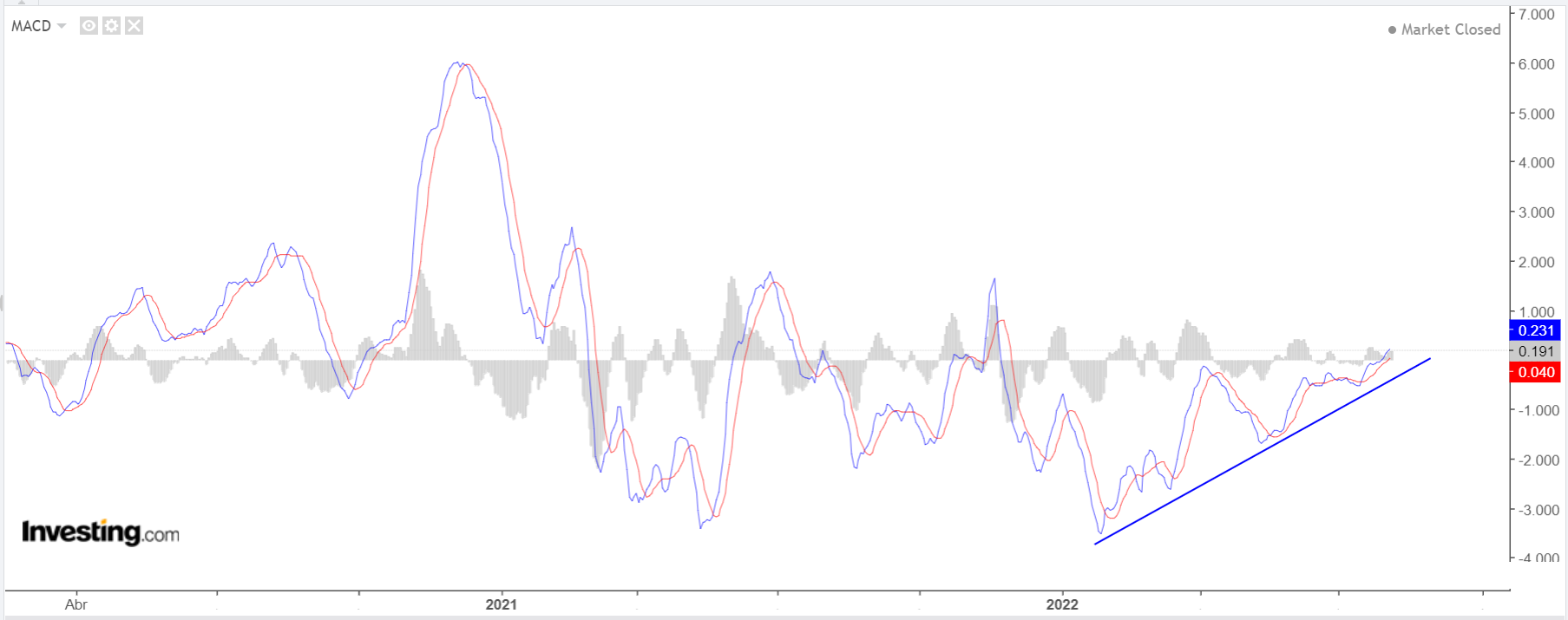 Caso rompa a zona pelos 10, que coincidiria com o rompimento do suposto retângulo, e tendo em conta que tem uma divergência + no MACD no gráfico diário, seria um sinal positivo apenas no curto prazo.