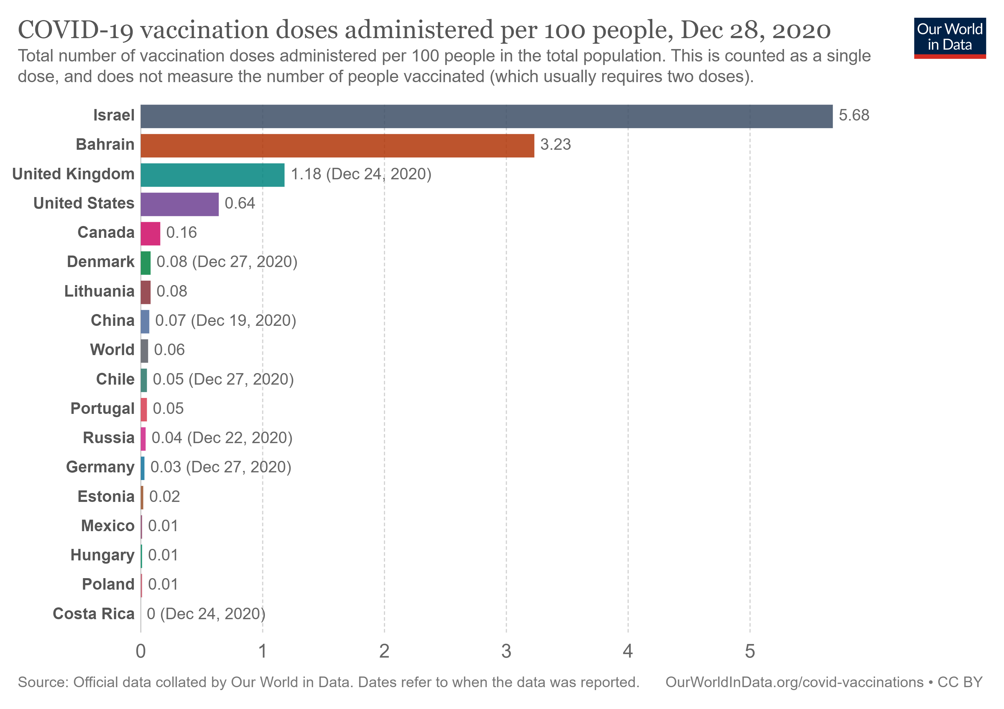 COVID-19 vaccination doses administered per 100 people, Dec 28, 2020