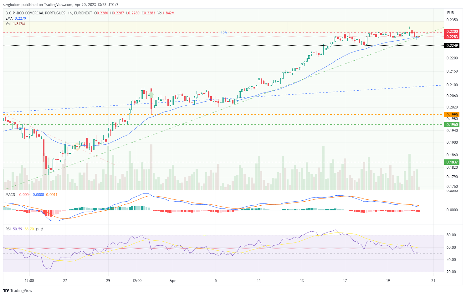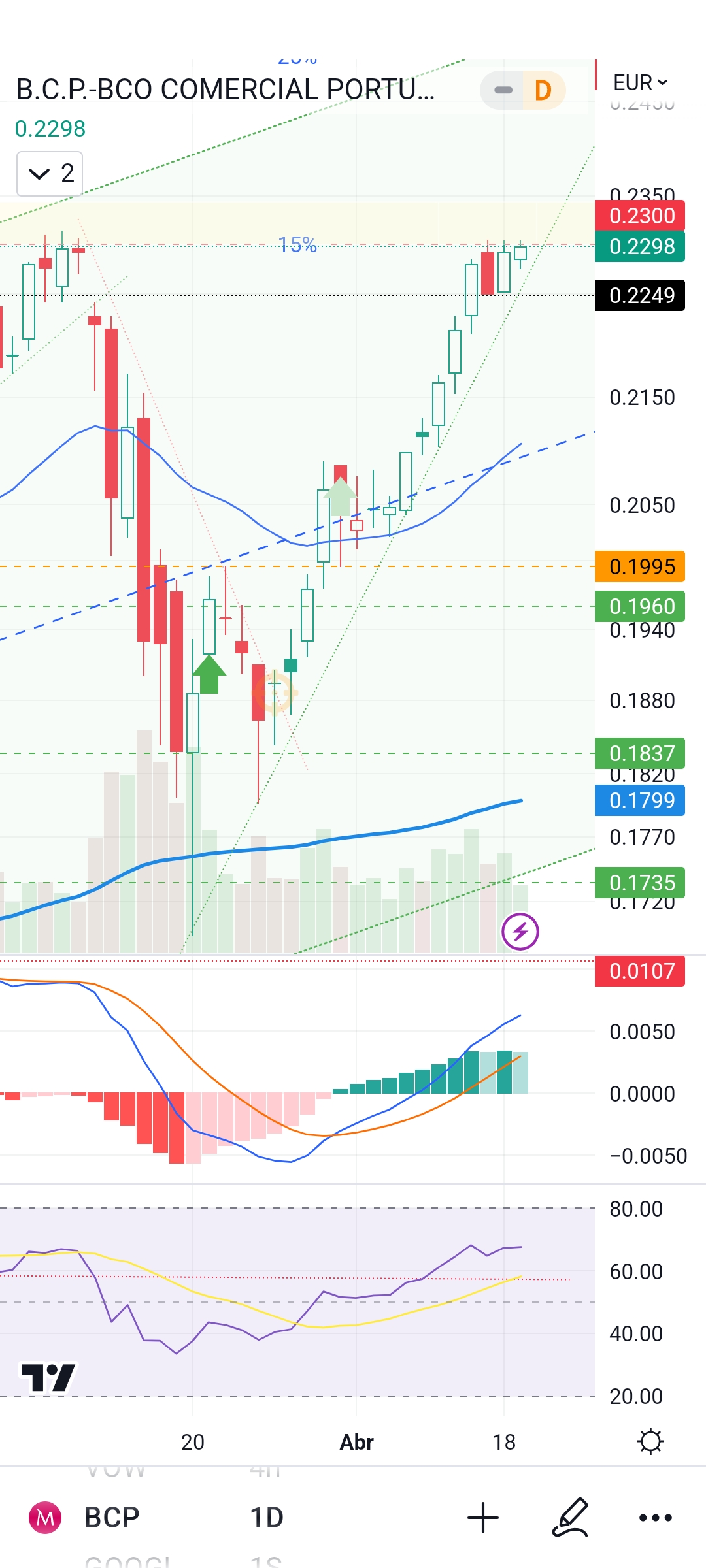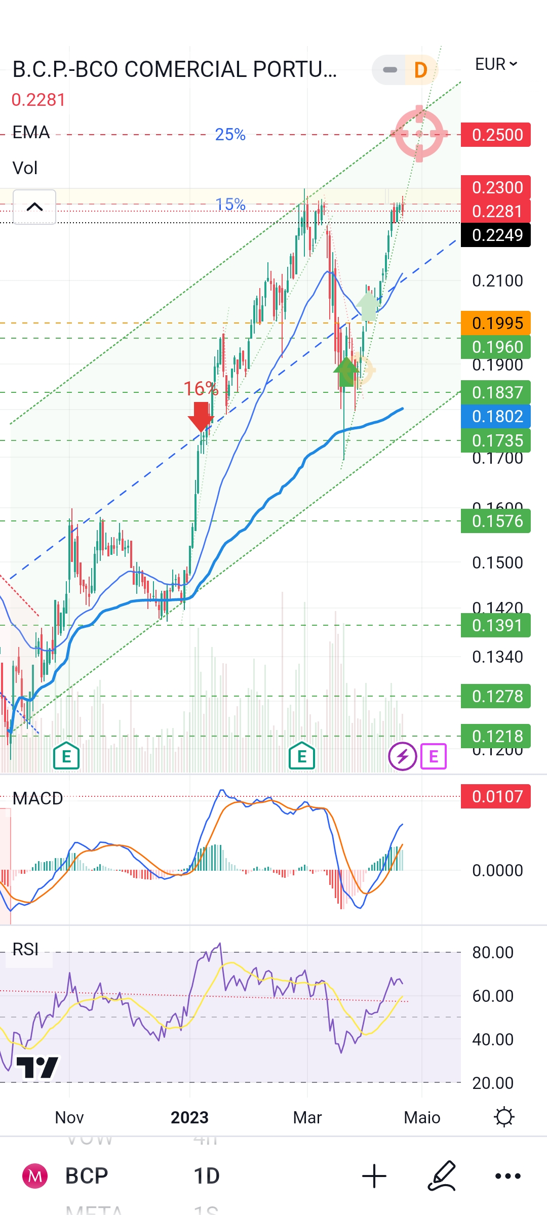 eu de esperto tenho muito pouco, mas a minha linha de tendência ainda não foi quebrada, o RSI diário mostra folga para subir e ainda que o MACD pareça estar a querer virar, eu estou dentro e a acreditar que a quebra da resistência nos 0,23 acontece ainda esta semana.