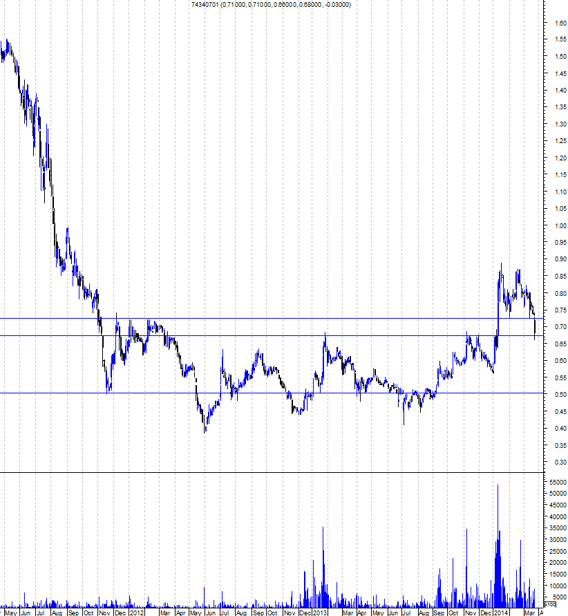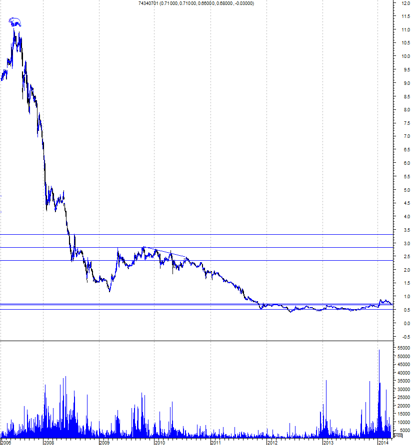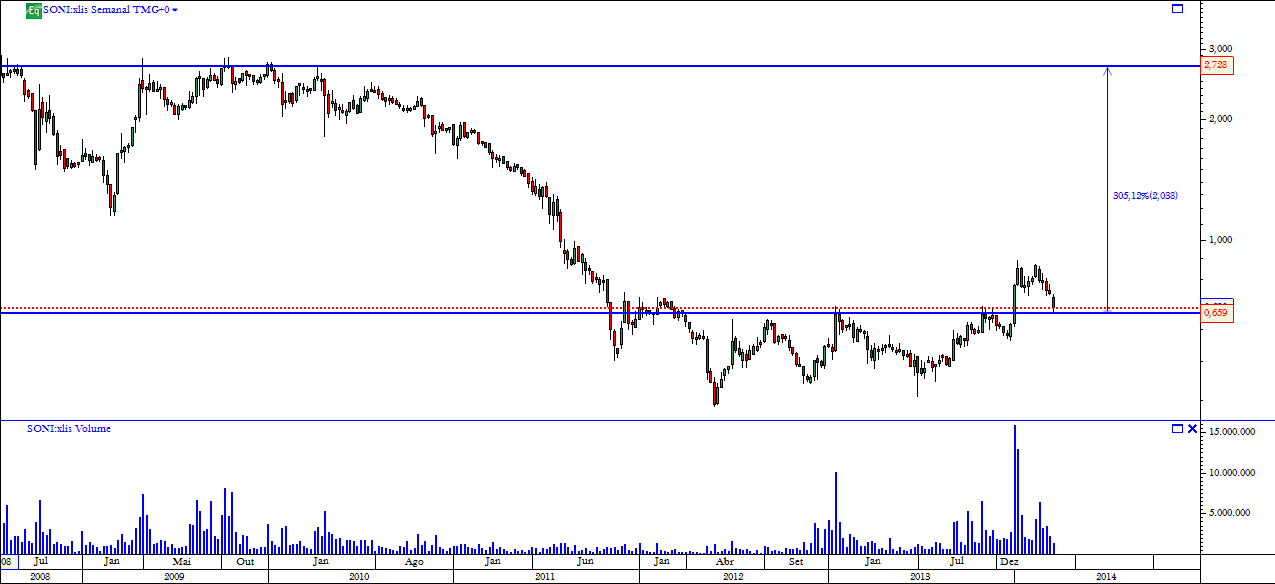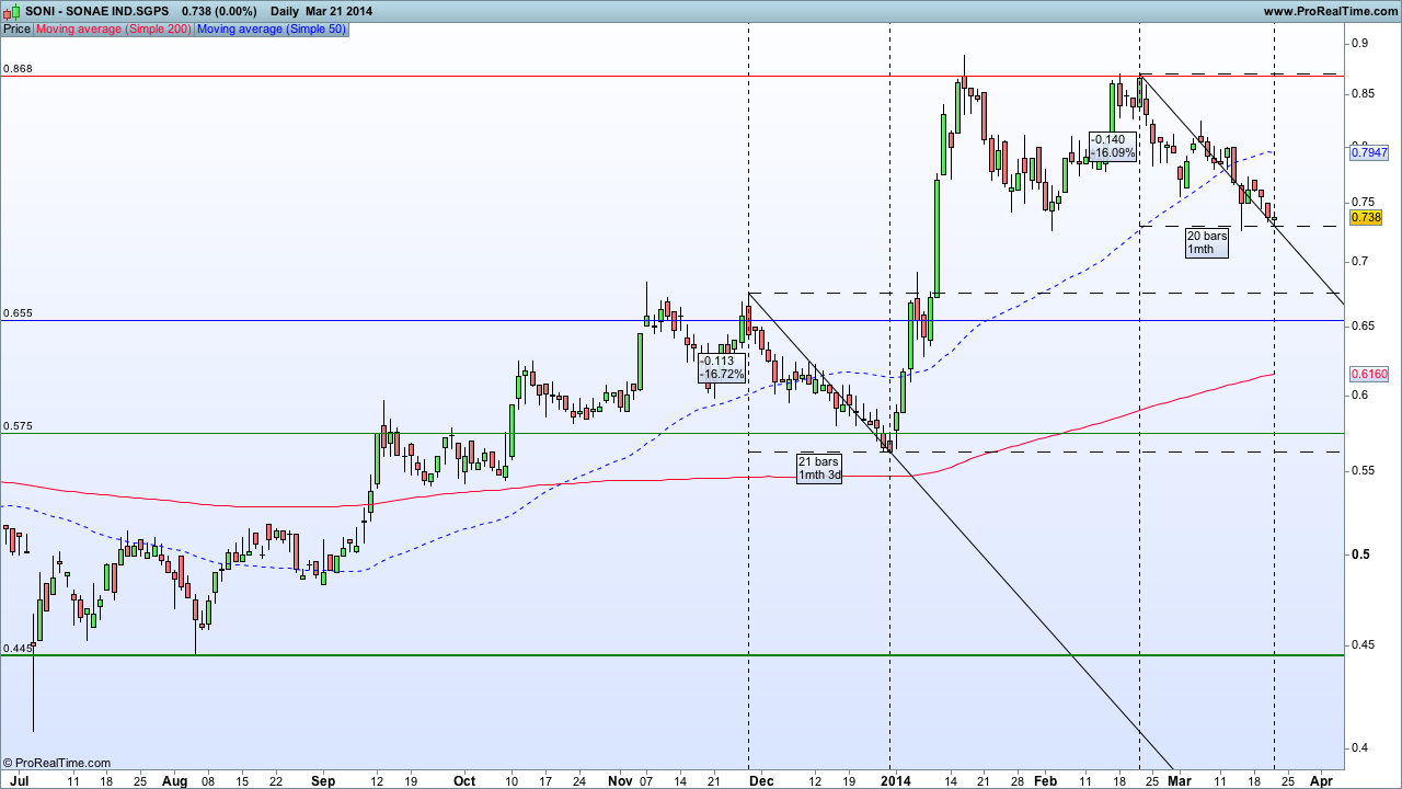 Deixo a curiosidade de que em Novembro 2013 depois de a SONI ter feito um duplo topo nos 0,66-7€ seguido de uma correcção de 16%, teve uma subida de 57%. Neste momento tivemos um duplo topo nos 0,87€ e já levamos 16% de correcção...