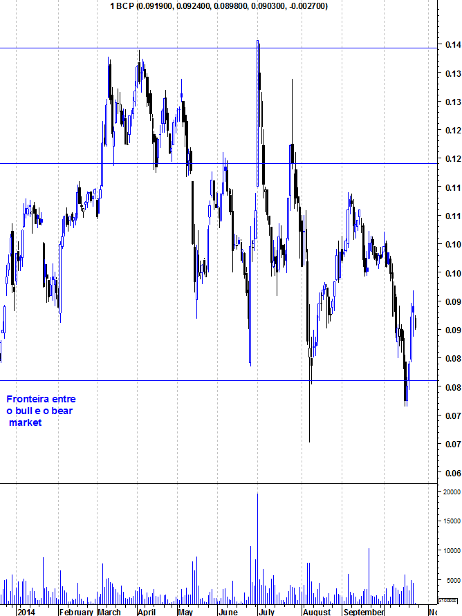 Tecnicamente, o BCP está em cima de uma formação, digamos, "perigosa"! Há, de facto, espaço para subir. Mas se houver inversão, este momento técnico a que me refiro costuma (não é regra, mas verifica-se muitas vezes...) atirar as cotações com violência para o lado que indica. Neste caso, o fenómeno, a acontecer, será bearish.