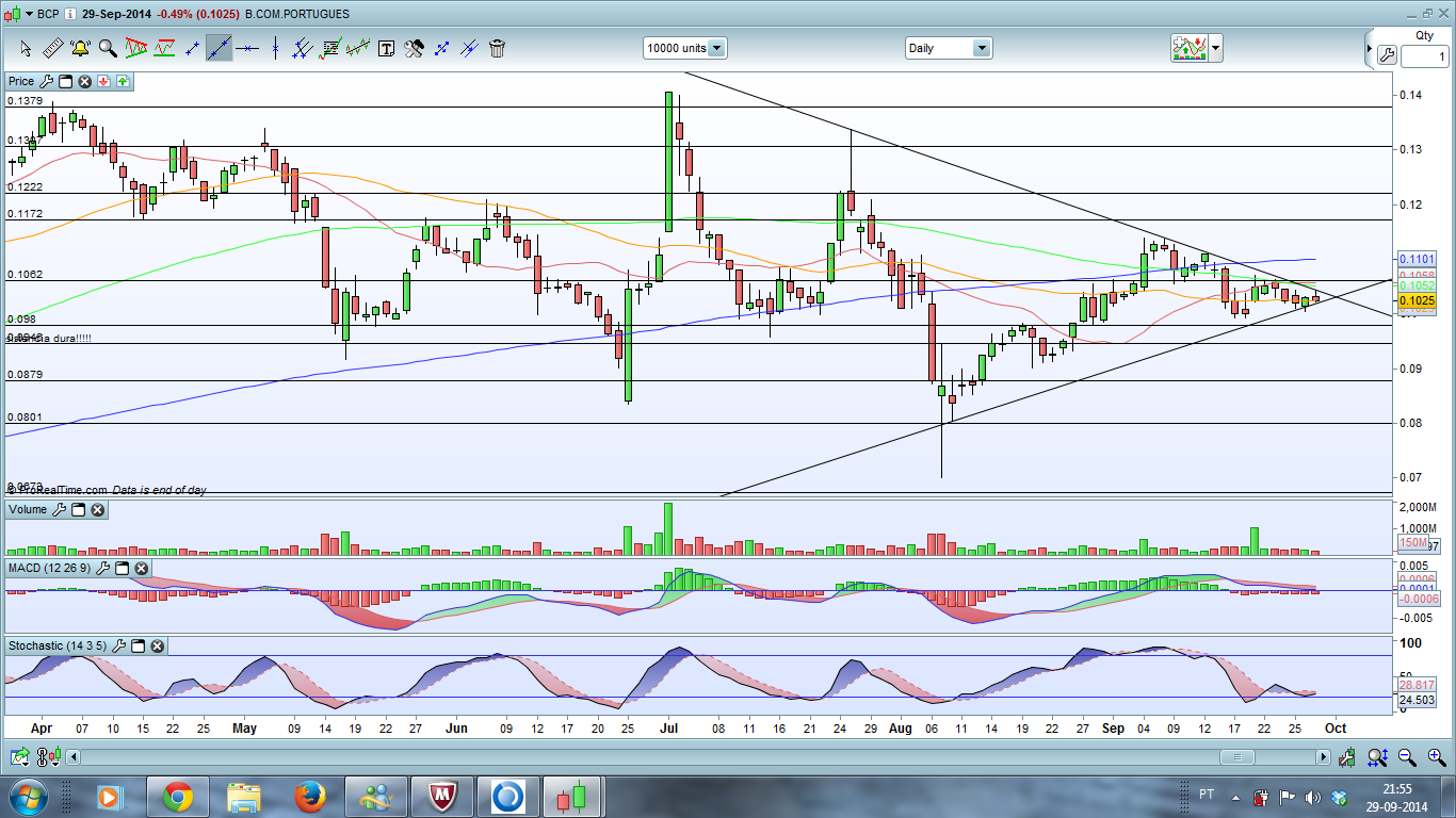 Na minha IMHO, a evolução do BCP continua na mesma. A cotação lá se encontra a oscilar em território neutro, isto é, continua na dança dos 50 (para quem gosta de fibos), com evidente/eminente ajuntamento das três principais MM´s (50, 100 e 200).