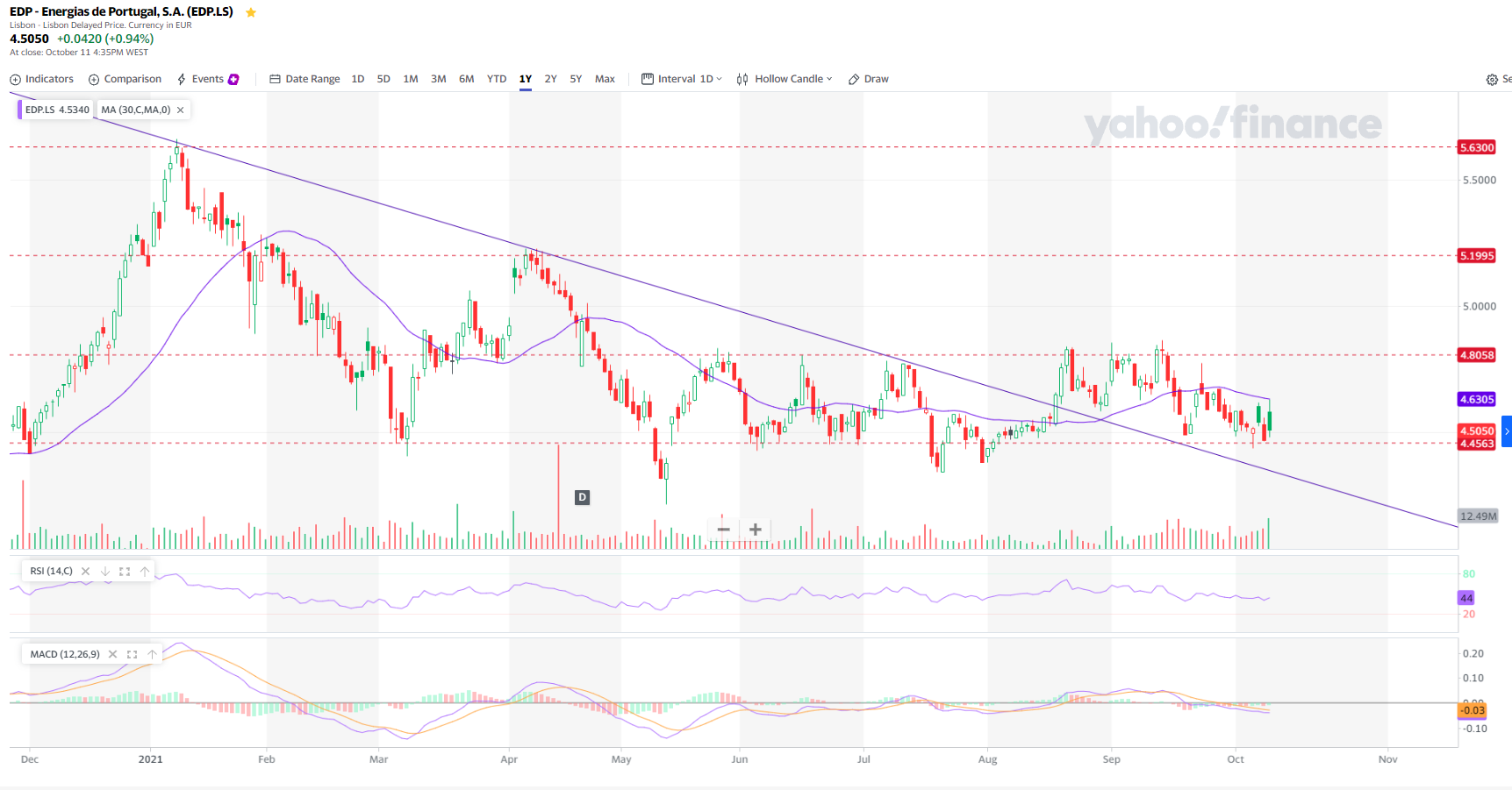 EDP está próximo de um suporte a 4.45€, e com dificuldade desde abril em ultrapassar a resistência a 4.8€.