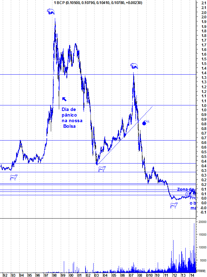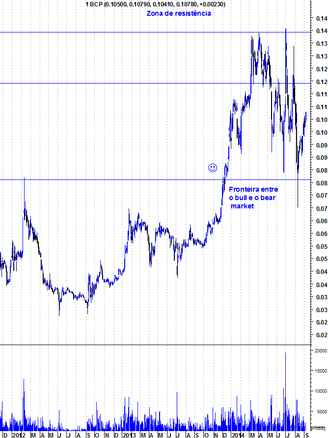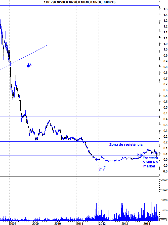Não posso dizer que o BCP esteja numa posição muito interessante para a minha análise, pois apenas consigo definir zonas importantes de suporte e resistências bem largas.Apesar de ter uma resistência na zona dos 0,12 euros é na zona dos 0,14 euros que está a grande resistência da acção. Por outro lado, a zona de suporte nos 0,08 marca a fronteira entre o "Bull" e o "Bear Market". Intervalos demasiado largos para uma análise interessante.