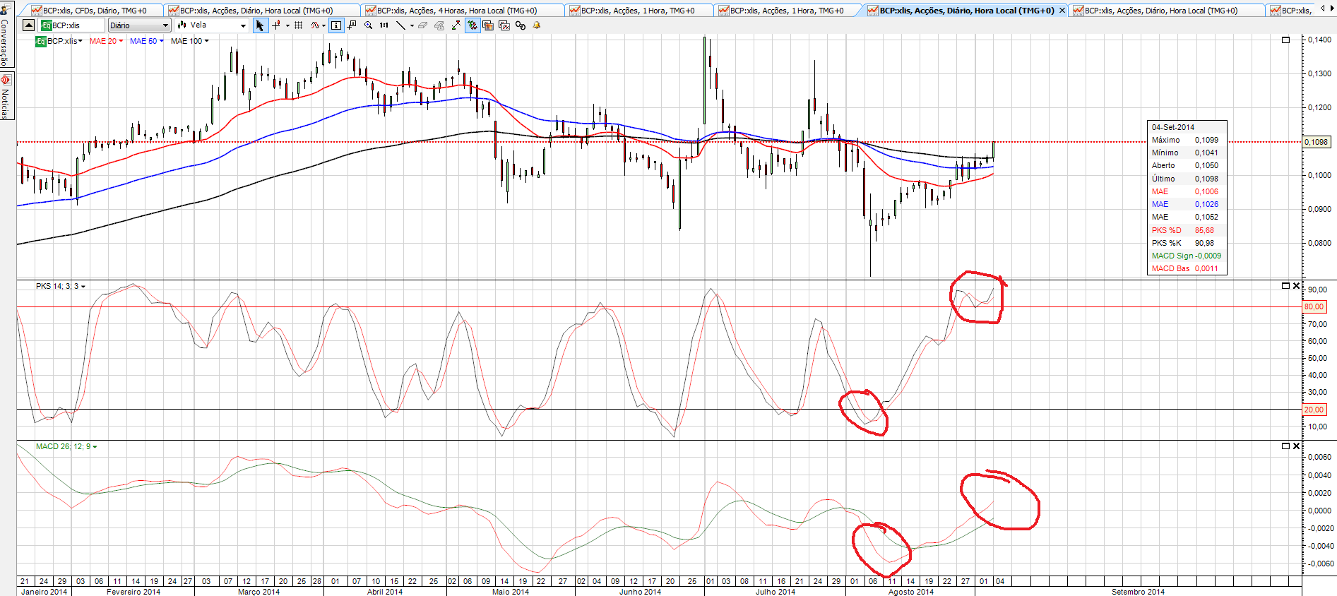 Não querendo estragar um momento de euforia chamo a atenção para um alguns indicadores técnicos que devem ser tomados em atenção. No dia 06-08-2014 eu coloquei um post onde dizia a um outro forista (na altura caia brutalmente) que podiamos estar num ponto de inversão pois o stocástico e o Macd estavam muito sobrevendidos. Agora estão-se a aproximar dum ponto de sobrecompra muito forte. Estas coisas não são matemáticas e logo há sempre espaço para estarmos mais uns dias a subir mas na minha opinião podemos estar a chegar a um ponto de fadiga em que há que contar com um movimento de retrocesso (nem que seja para ganhar gás para subir mais tarde.