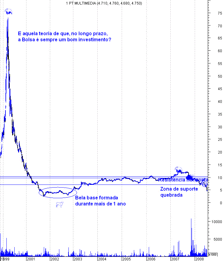O que aconteceu foi um excesso nas subidas, uma autêntica "bolha". Tudo o que tinha ".com" no nome voava. A economia estava pujante e o sector da Internet crescia a um ritmo alucinante. Começaram a fazer-se contas para crescimentos absolutamente insustentáveis a longo prazo. Em escassos 4 meses, a PTM quadruplicou de valor.
