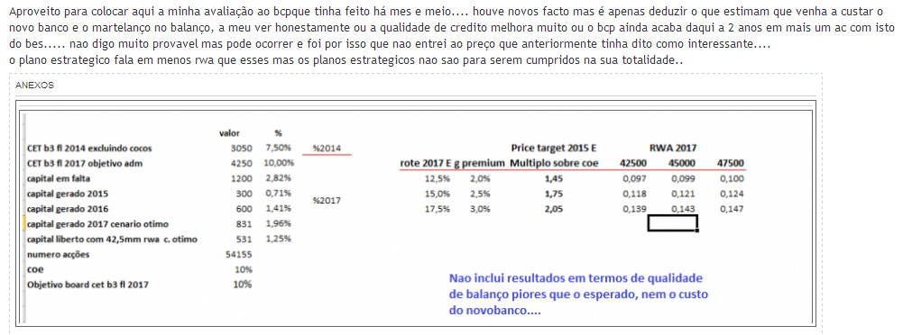 Fui ao aumento de capital, obviamente antes de se saber da questão BES. O BCP tem feito uma trajectória notável nos ultimos 2 anos, nomeadamente ao nivel da margem financeira e redução de custos, comercialmente está activo. As unicas questões que me deixam a pensar são os impactos do FResolucao e as imparidades. Sobre a primeira não se vêem noticias, já a segunda lendo o a apresentação do R&C do 1 S verfica-se um otimismo no que toca aos NPL (Non Performing Loans), sendo que as projecções de resultados futuros assentam em parte na redução substancial das imparidades. Caro Artista Romeno, pode explicar esta questão das imparidades e falta de capital? Obrigado.