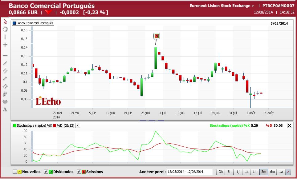 mas o inverso tambem pode suceder, eu nao gosto de cenarios catastrofistas ate porque tenho uma pequena percentagem da carteira na russia ao barulho, ( no entanto a aposta é a 5 anos, e a perda está suportavel), o aviao da malasia começou a baralhar tudo ali, mais do que o que ja estava mas nao acredito que o bcp chegue a cair por isso, ou por outro lado era muito mau sinal que fosse por isso, a meu ver se o AC do bcp tem sido 3000m e a direção tem reembolsado todos os cocos, haveria maior conforto relativamente ao futuro do banco, dizer que isto do bes foi mau muito mau, e mandou o preço ao fair value e abaixo deste ate em 3 2 1... agora vamos ver
