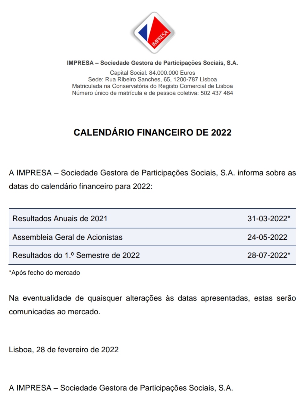 Segundo comunicado á CMVM, apresentação de resultados anuais são dia 31-03-2022 e não dia 03-03-2022