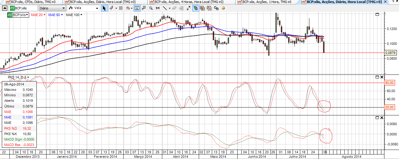 Olhe, até lhe deixo aqui um facto bem concreto que normalmente costuma dar dinheiro. Que é olhar para o Stocástico e o MacdD e verificar onde estão os mesmos. Se verificar o Stocástico está a ficar muito sobrevendido. O Macd ainda tem algum espaço para descer. Baseado nisto eu diria que pode haver mais uns dois dias de queda e depois inverter. É mais agradável que a espera do fim do mundo não ? Vamos ver o que sucede nos próximos dias....