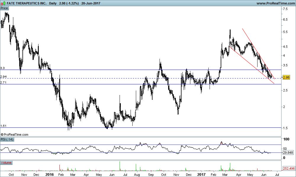 Deixo mais uma que ainda não inverteu mas considero interessante, a FATE Therapeutics. O preço parece estar numa retração dentro de uma Falling Wedge que poderá ainda ser a handle de uma "chávena" (apesar de esta ser tradicionalmente uma figura de continuação). Está também em zona de suporte com vários indicadores 'oversold'.