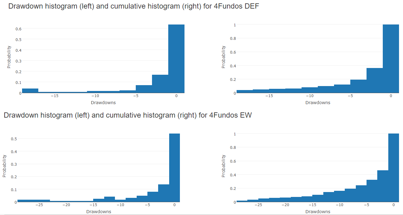Com cotações mensais a probabilidade de o drawdown da 4Fundos DEF estar entre -2 e 0 é de 64% por outro lado a 4Fundos EW está "apenas" 54% do tempo nesse espaço. Faz sentido, a 4fundos EW é mais arriscada e com isso tem mais drawdowns e mais profundos. Quaisquer questões sobre a análise dos histogramas estejam à vontade para perguntar.