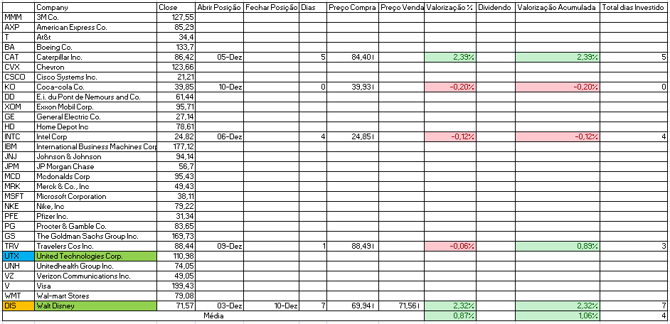 Relativamente ao dia de amanha, quarta-feira dia 11 de Dezembro as indicações são de compra da United Technologies Corp. e da Walt Disney (neste caso a Disney aparenta alguma fraqueza, por isso amanha antes de comprar terei de simular o fecho).