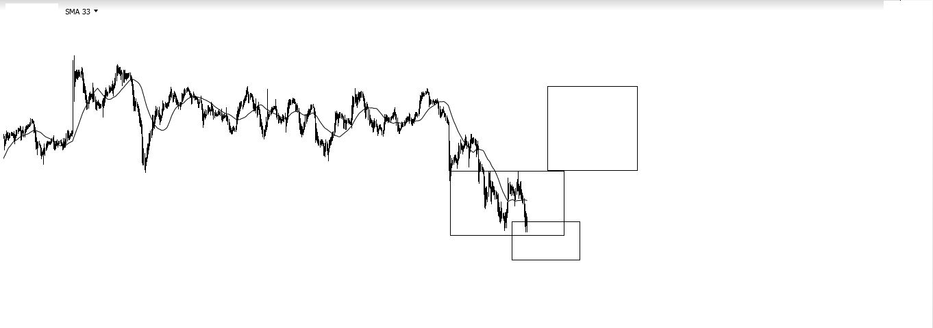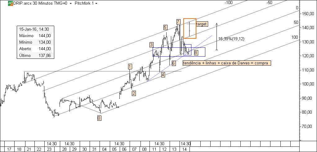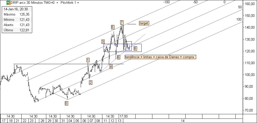 Oportunidade especulativa delineada com recurso às caixas de Darvas: para se realizar a compra o preço deverá estancar na caixa de baixo, sendo o target dado pela caixa de cima.