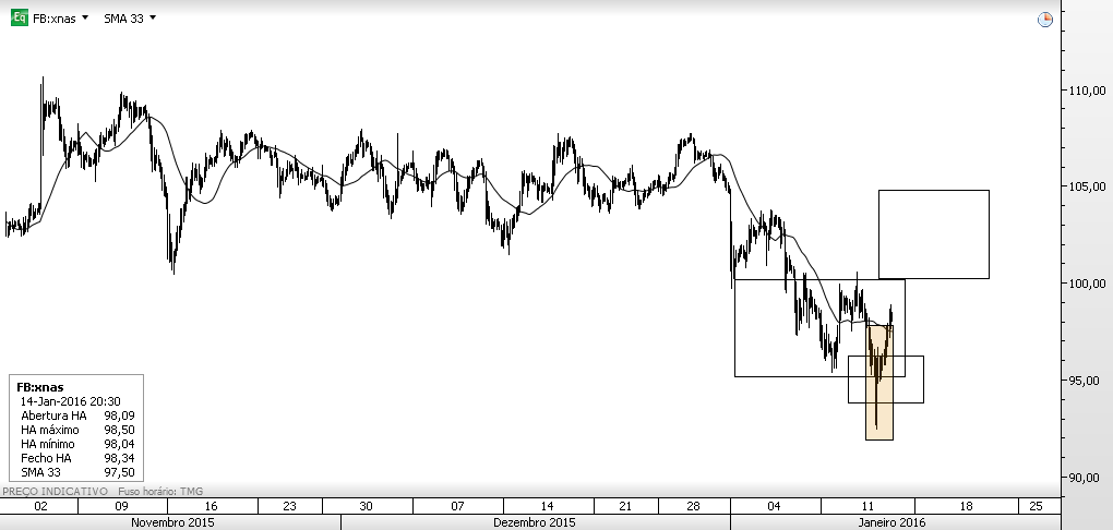 Na caixa o preço penetrou, aí estancou e ordem de compra executou. O target inicialmente traçado foi substituído por um fecho manual da posição quando se verificou que o preço não logrou penetrar na caixa de cima, assim negando a probabilidade associada a esta técnica neste período temporal. Negócio concluído. Activo: fb, 30 m.
