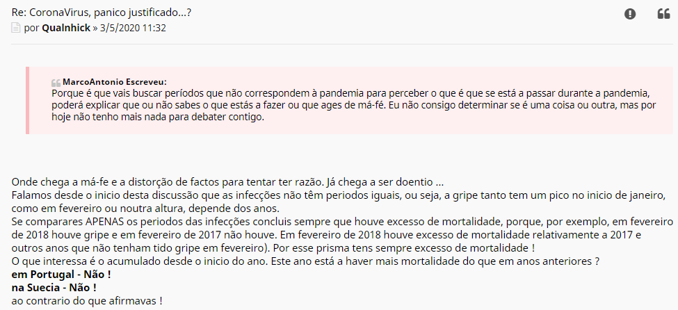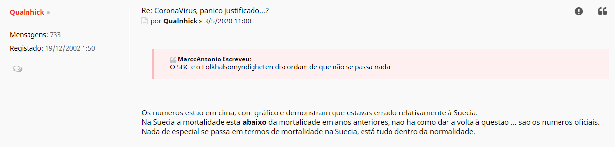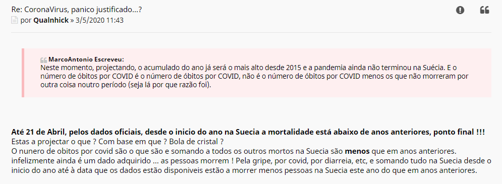 etc...Qualnhick Escreveu:"Até 21 de Abril, pelos dados oficias, desde o inicio do ano na Suecia a mortalidade está abaixo de anos anteriores, ponto final.