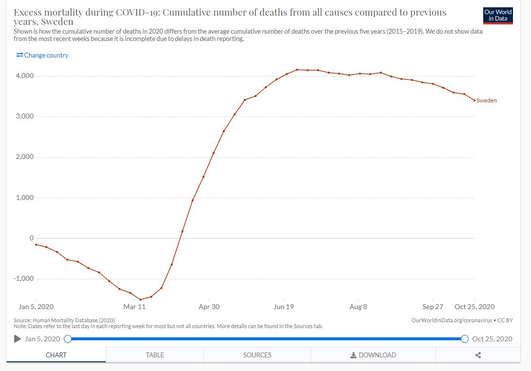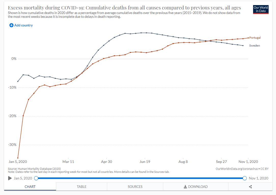 Depois disso a mortalidade disparou na Suecia ? Sim, tiveram um mes de Abril e Maio maus, mas tem vindo a baixar e tiveram os meses de Agosto, Setembro e Outubro com menos mortalidade nos ultimos 5 anos, ao contrario de Portugal.