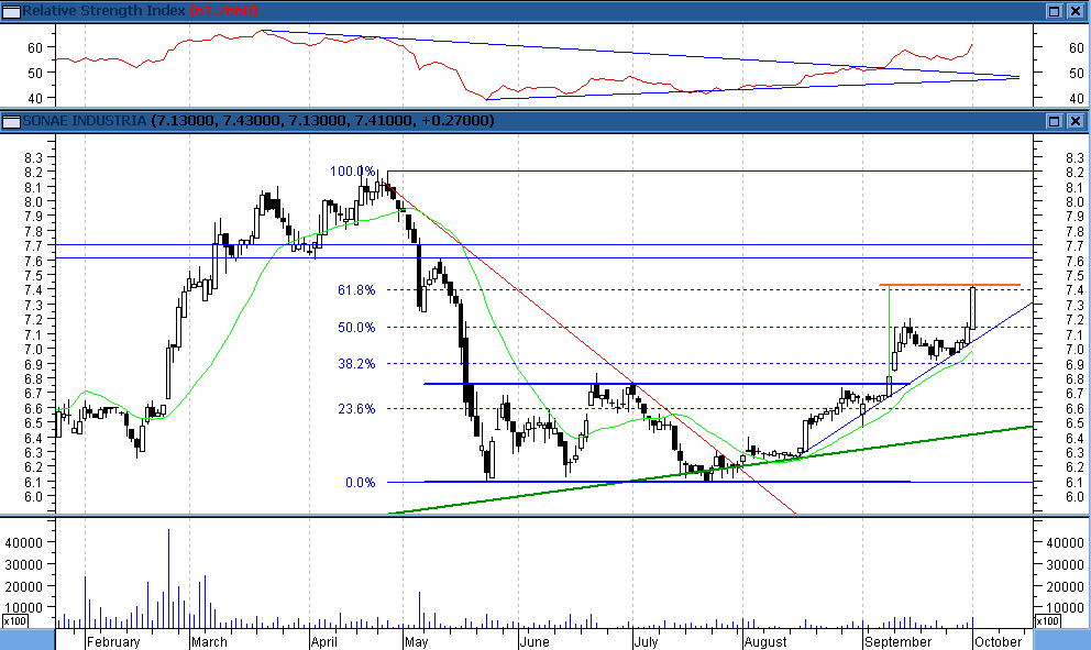 Hoje foi um dia de mais valias na soni, o que a fez corrigir um pouco, mas manteve-se, julgo eu, dentro do canal ascendente começado em Agosto. A subida de ontem pareceu-me demasiado forte,uma surpresa para mim, mas hoje a correcção colocou-a no caminho certo.