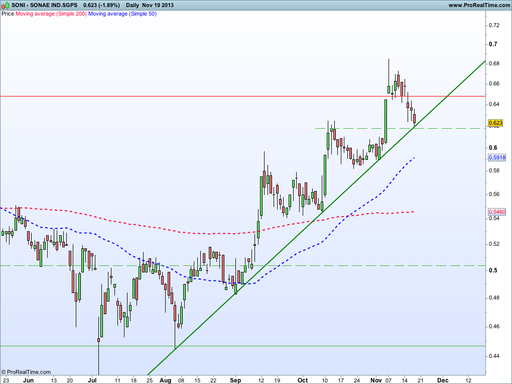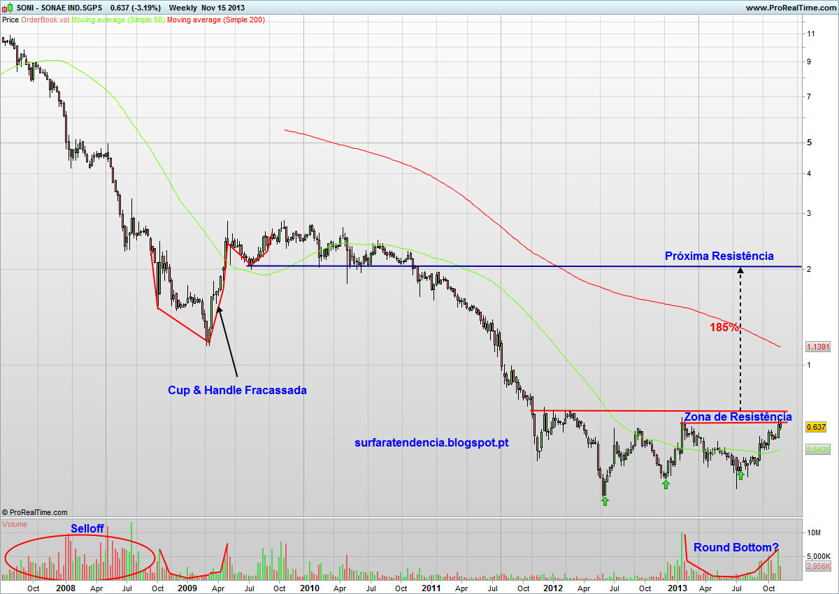 A zona de resistência que está imediatamente situada acima da actual zona de preço é forte, forte o suficiente para representar a fronteira entre o bear e o bull mode. Se a sua quebra acontecer a sonae indústria passa imediatamente a representar uma atraente oportunidade de compra. São 185% de distância até à próxima resistência! Resistência que, inclusivé, é já bastante antiga. Até que a zona de resistência quebre não vale a pena arriscar uma entrada. Vejam o que aconteceu em 2009, quando tudo apontava para uma activação do padrão de inversão cup & handle. A activação acabou por nunca acontecer e as cotações chegaram a estar a cair 85% em relação a esse ponto!