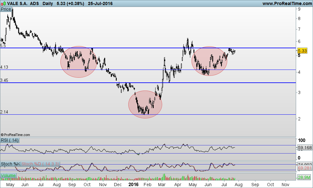 Quando passamos para o diário vemos que o titulo respeitou sempre a resist de 4$, logo dando boas possibilidades de short neste nível, e que desde inicio do ano vinha fazendo novos máximos, tendo em Junho feito uma quebra em alta com aumento significativo de volume. Melhor ainda, depois desta quebra faz um providencial "pullback" a zona dos 4! Um trader que entre nesta zona sabe onde pode sair sem grandes perdas caso o preço vá contra si.