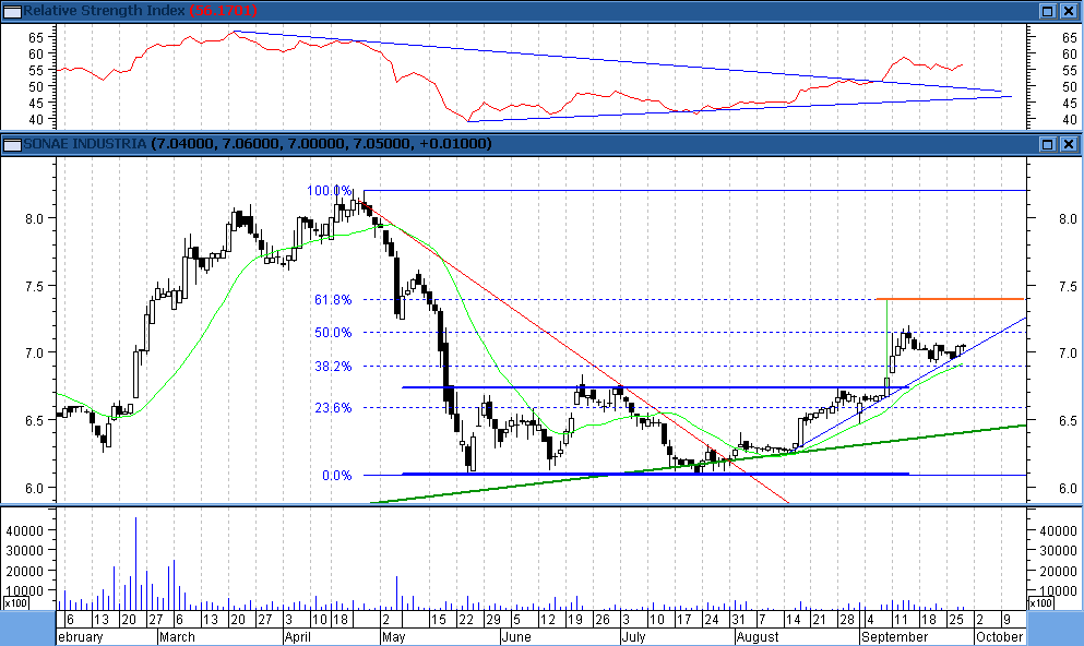 Todos oa targets apontam para máximos históricos. Está com um gráfico quase perfeito, há interesse no título já que a soni é lider mundial de laminados e afins e tem mostrado ter "músculo" para responder a um ou outro mau momento (incêndio no Canadá). Este 3º trimestre é normalmente o pior do ano devido às paragens para manutenção das fábricas. Mas os dados comparados com o ano anterior poderão ditar o título no caminho de máximos históricos. Julgo que estes acontecerão na divulgação dos resultados anuais de 2006. Por esta altura, a fábrica do Canadá começará a laborar em pleno e será o factor que vai catapultar o título para perto dos 9 euros. Se o mercado continuar bull, poderemos tê-la perto dos 9,5.