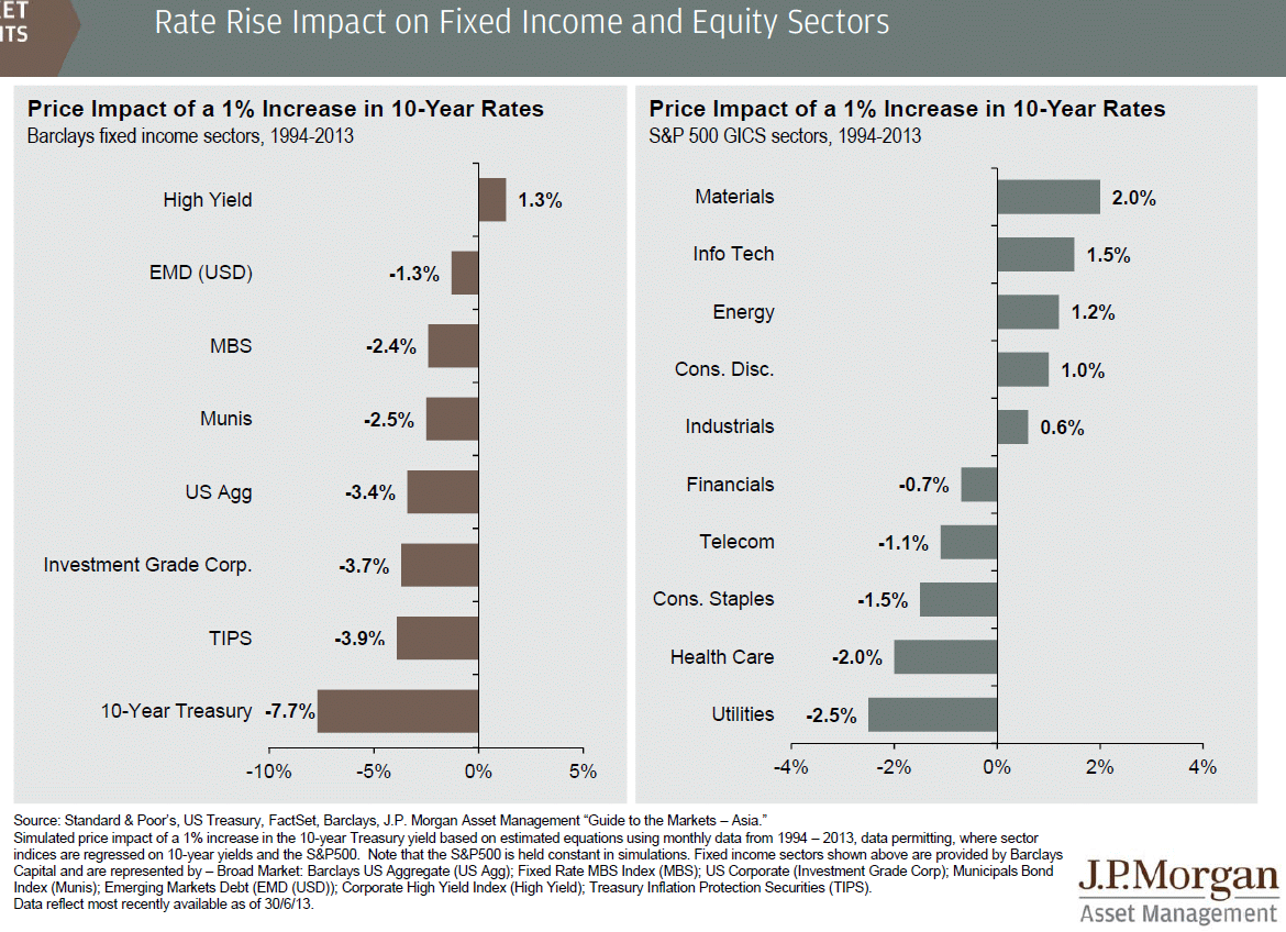 Nota-se que realmente existe uma escala de valorização consoante os vários tipos de activos. Mas para além do aumento das yields nas obrigações, que provocaram vários efeitos nos vários tipos de activos, mas também existiram outros motivos de valorização ou desvalorização destes activos, no caso das obrigações municipais ("Munis"), existiu a entrada em falência da cidade de Detroit e a existência outras cidades em risco de acontecer algo semelhante. Logo, os retornos no paper da JPMorgan só se podem usar, num cenário de apenas valorização das yields das US Treasuries de 10 anos, sem ter em conta, outros factores que também influenciam os seus desempenhos.