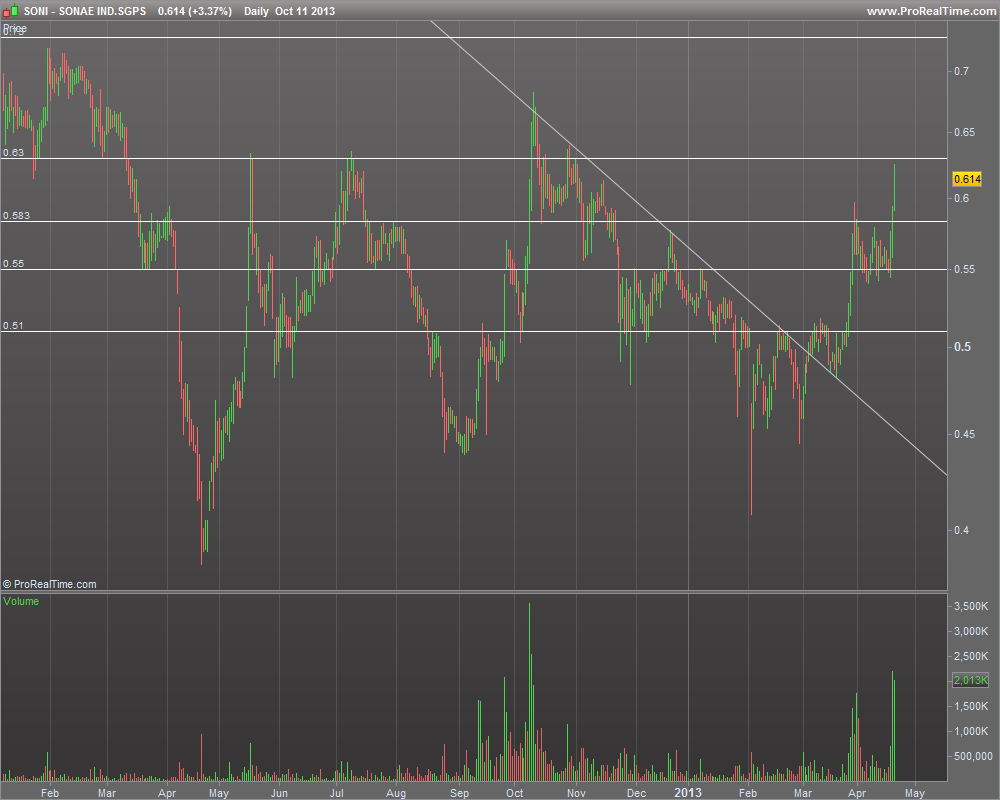 Um fecho acima dos 0,58 activará a bandeira de alta com target nos 0,63. O padrão é como nos livros, muito volume no mastro da bandeira e depois volume reduzido na consolidação. Hoje já testou essa resistência e espero nos próximos dias que faça o breakout.