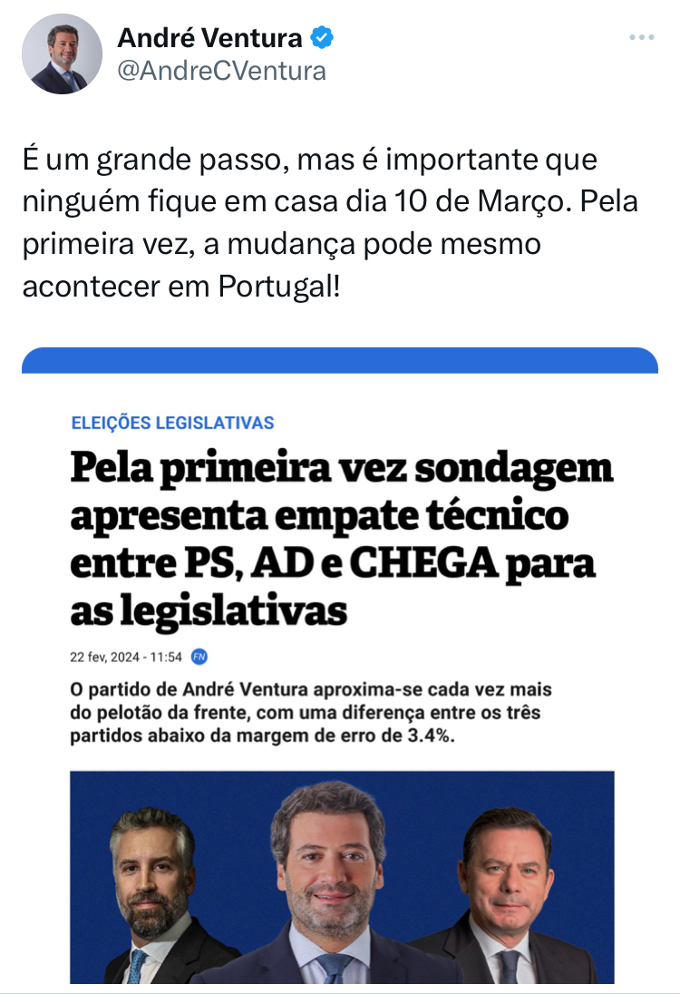André Ventura partilhou uma notícia de um empate técnico entre Chega, AD e PS e também disse na televisão na resposta a uma jornalista