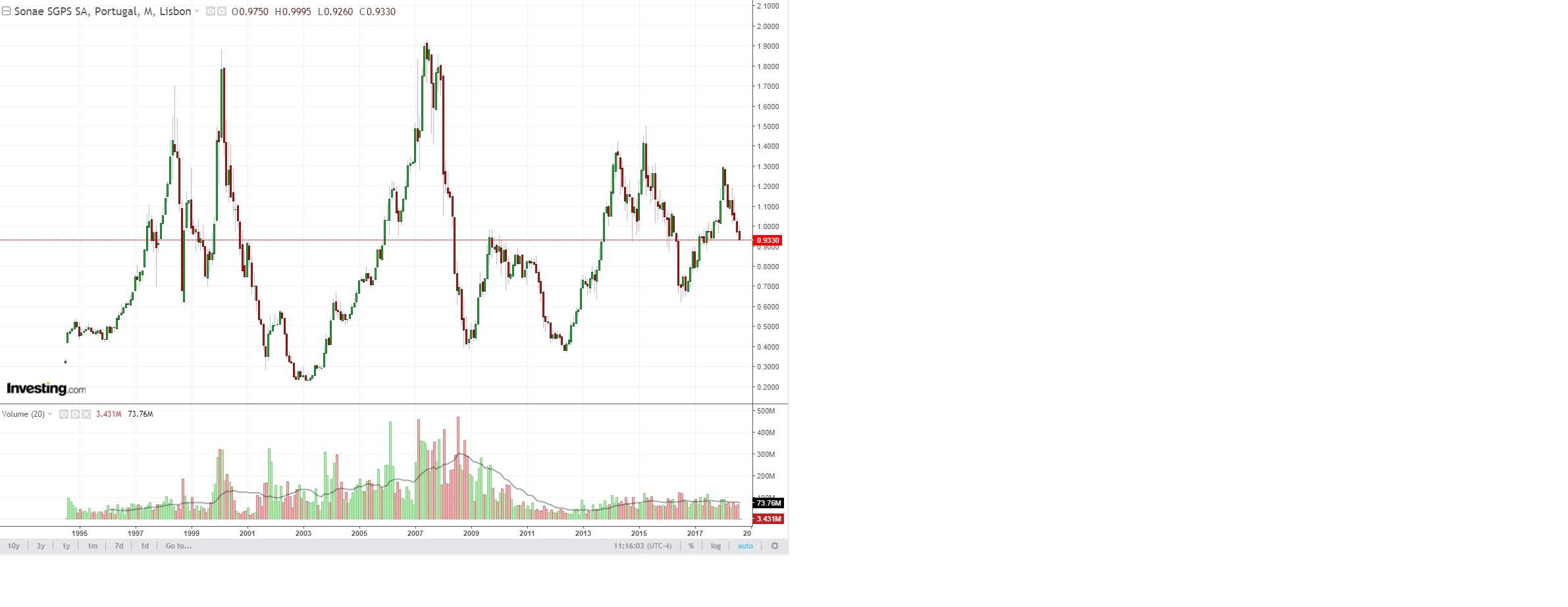 Meus caros forenses, a Sonae SGPS está HÁ ANOS, MUITOS ANOS MESMO... num regime de swings bem pronunciados ora Bull ora Bear, mas SEM SAIR DO INTERVALO de preços (grosso modo) 0,30-1,90€ conforme atesta o gráfico mensal em anexo. O que quer isto dizer: em cerca de 20 ANOS a ação não foi a lado algum... melhor dizendo, não registou uma tendência sólida de crescimento! Onde está a criação de valor? Sim é disso que se trata vendo a "big picture". As empresas que crescem... arrastam inevitavelmente as cotações para cima com o seu crescimento em valor. Novos negócios, melhoria de margens, rentabilidade a subir! Há alguma tendência de alta em 20 anos, tirando uns "swings" pronunciados na cotação? Zero! Distribui uns dividendos anuais... sempre coisa pouca, pois a justificação é sempre canalizar dinheiro para novas "oportunidades" mas tudo espremido por miúdos... o mercado não responde com uma tendência sustentada de subida das cotações e portanto, no aumento do valor de mercado da empresa. Agora as novas ameaças são a Mercadona, a Amazon a juntar aos já conhecidos "Players" Intermarché, Jumbo, Lidl, Pingo doce, Mini-Preço, etc. O falecido tio Belmiro, outrora o homem mais rico de Portugal, um "mago" da bolsa, da gestão e da criação de valor... ou a sua suposta e "fantástica" e estudada em "case studies" equipa de gestores de topo... nada mais fizeram que a manutencão da cotação dentro deste intervalo! Crescimento no valor de mercado apenas em certos períodos onde tudo subia...mas sublinho, verdadeira inovação que traga valor e investidores consigo e puxe pela cotação, nickles! Já se ouve há anos que a Sonae está subavaliada por causa de ser uma espécie de conglomerado de empresas diversas e que não espelha no mercado o seu real valor... há muitos anos que se ouve isto! Mas a dura verdade é que esta empresa vale no mercado o mesmo que valia há 20 anos atrás...! Vejam o gráfico...! Ok, dá para "surfar" uns swings na bolsa... uns movimentos bell-bear, mas é mais do mesmo, seja com Belmiro ou Paulo ou Cláudia... VALOR E CRESCIMENTO talvez só existam aos olhos de quem é míope! Se o mercado no médio e longo prazo espelha o real valor das empresas... aqui está a sua resposta: "Show me the real value"