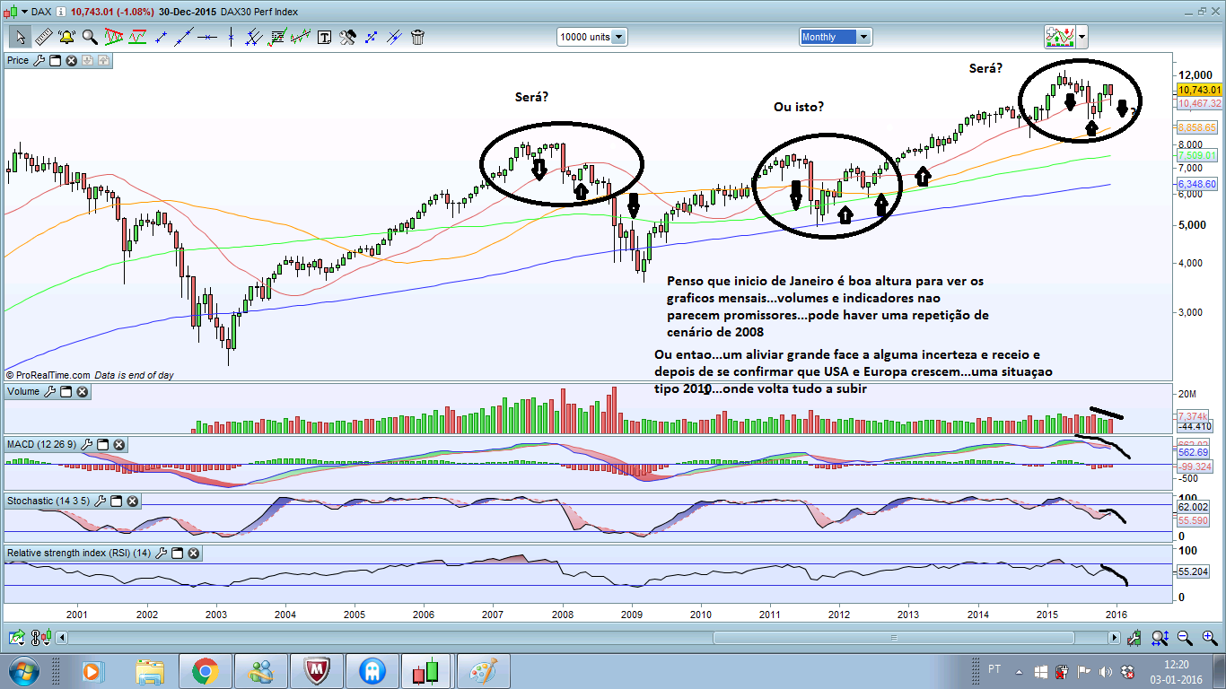Graficos Mensal, Semanal e diario...a coisa parece-me muito perigosa...ate pode fazer como no ano passado...inicio titubeante... a diferente está na reaccao que houve seguir...nao ache que o DAX volte a escalar 3000 pontos...a nao ser que o EUR afunde...