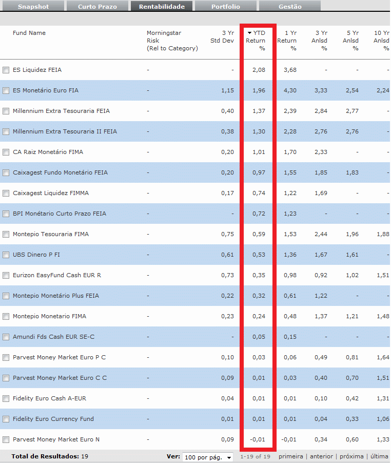 Falando recentemente em fundos monetários/tesouraria, deixo uma imagem de um quadro com os retornos destes tipos de fundos em Espanha, dando para comparar os seus retornos com os nossos: