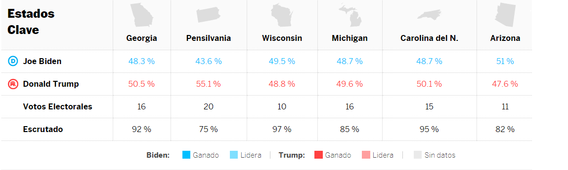 Há, Wisconsin, Arizona, Nevada e Carolina do Norte para o Biden. Os restantes para o Trump.