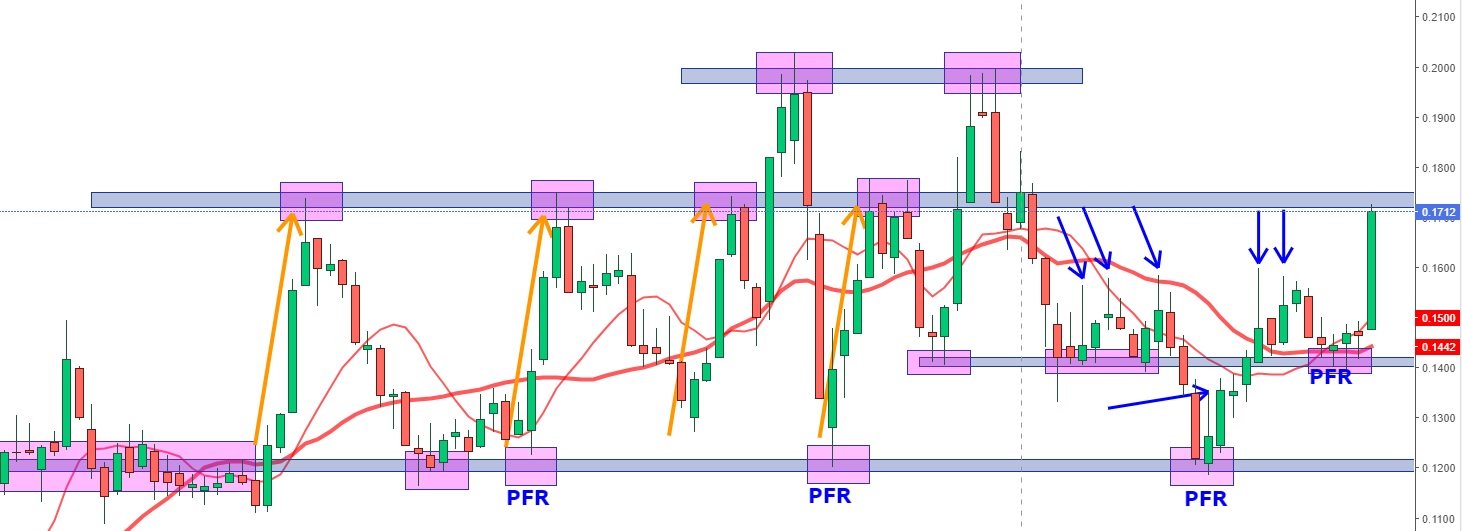 Agora não me levam a mal, mas é apenas um cenário (nada tem de análise) que considero que podia ser interessante: amanhã 6ª feira, no gráfico diário fazer mais uma subida mas fechar negativa, ou seja, abaixo de hoje. Poderia nessa situação surgir um novo PFR (máxima superior às duas sessões anteriores, mas fechar abaixo da anterior), mas agora de baixa para vir consolidar na última resistência na zona dos 0.1575, a resistência passar a suporte e voltar para cima.