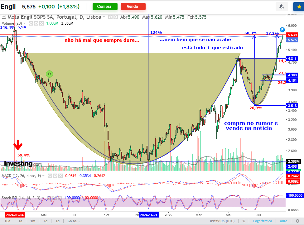 Face a estas premissas é normal existirem muitos investidores neste momento a fazer mais valias com "medo" que a cotação não vá acima dos 6, uma mega resistência psicológica. Especialmente quem possa ter ficado "escaldado" com o claramente especulativo (e desproporcionado) ataque shortista à Mota-Engil de há 1 ano atrás.